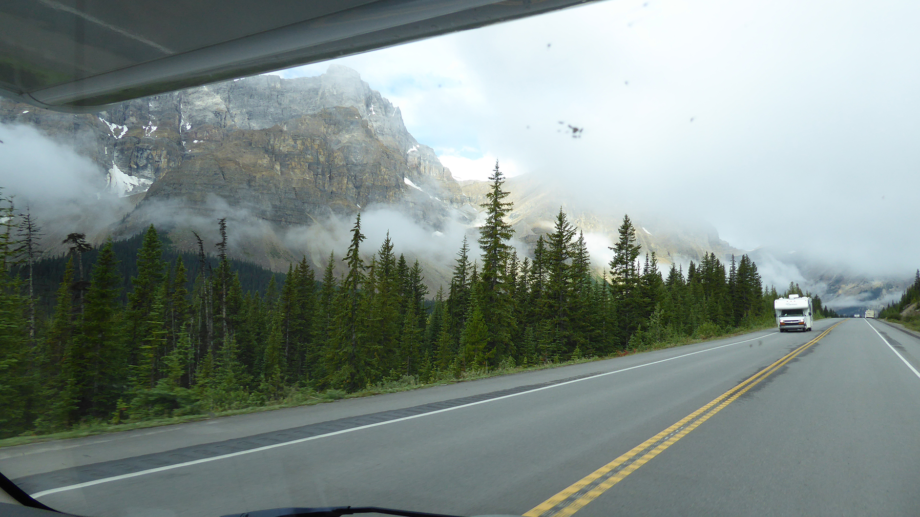 Schnell fahre ich zurück und hole sie, nach meiner Rückkehr ist die Gruppe immer noch beim Einkauf. Abschließend geht es den gegenüberliegenden Liquor Store, wo noch einmal die Kreditkarten ordentlich belastet werden. Schließlich verlassen wir Airdrie gegen 15.30 Uhr Richtung Banff. Wir wählen die Autobahn, damit wir noch zeitig auf dem Tunnel Mountain Campground eintreffen. Unterwegs gibt es eine Schrecksekunde, als der letzte Wagen per Funk meldet, dass die Klappe eines voraus fahrenden Fahrzeugs geöffnet ist. Wir halten alle auf dem Standstreifen, das Problem wird mit aller Vorsicht beseitigt und dann geht es wieder auf die Bahn, wobei uns der letzte Wagen die Spur frei hält.
