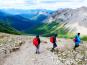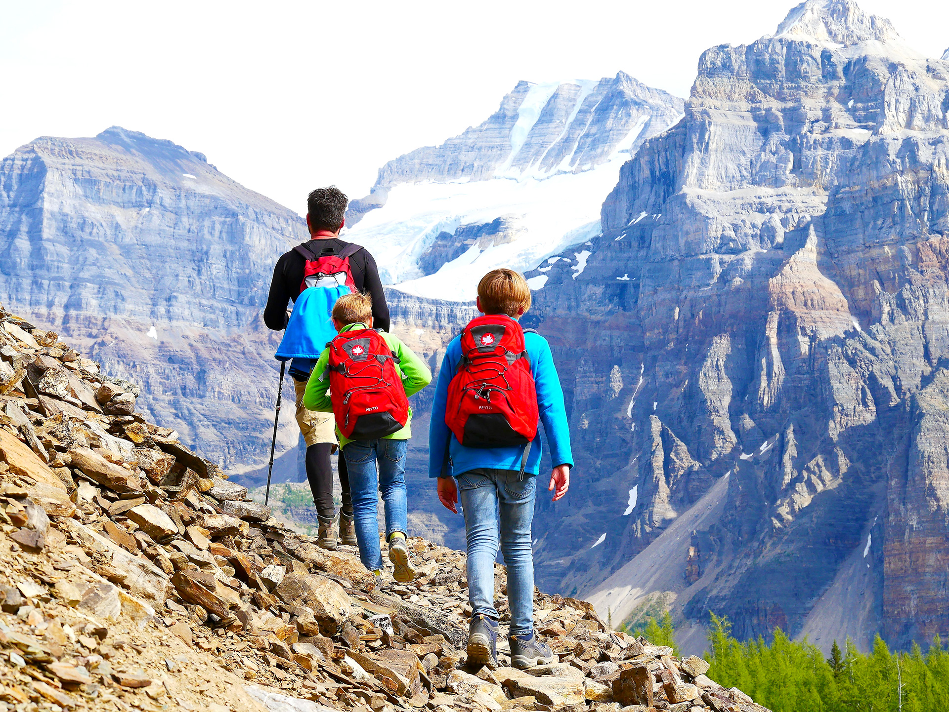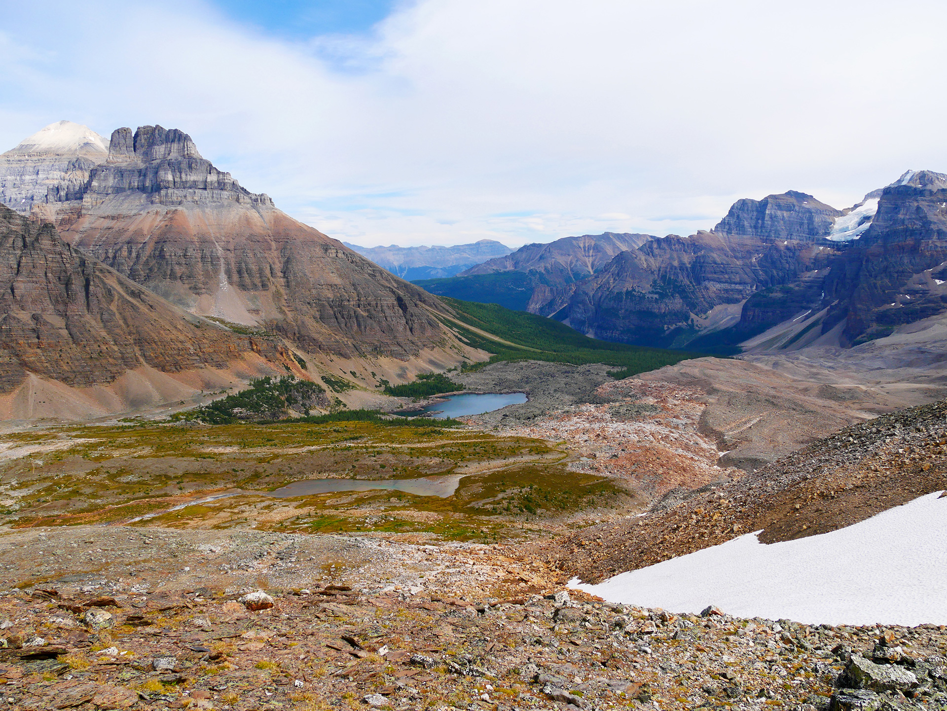 Der Weg um den See war noch rappelvoll, am Platz vorne bei den Booten mehrere hundert Touristen, aber man staunt ja, dass die meisten es nicht mal um die nächste Ecke schaffen. 99 % aller Touris lässt man hinter sich, wenn man sich einen längeren Trail vornimmt. So lichtete es sich recht schnell, und auf dem Waldweg oberhalb des Sees, der recht steile Passagen hat und den wir zügig hochstiegen, überholten wir mit unseren schnellen Jungs (auf die wir echt stolz sein können) vier Wandergruppen, dann sahen wir kaum noch jemanden. Der Weg wurde immer schöner, als sich der Wald langsam lichtete und wir hin und wieder von weit oben herrliche Ausblicke auf den Moraine Lake hatten, der unter uns in einem fast schon kitschigen Türkiston im Tal lag. Nach einiger Zeit traten wir weiter oben aus dem Wald heraus und kamen auf einen steinigen Weg, der ab hier weitgehend flach verlief, mit unfassbarem Bergpanorama. Man hat während der ganzen restlichen Wanderung einen beeindruckenden Ausblick auf das Valley of the Ten Peaks und den Eiffel Lake und kommt aus dem Fotografieren gar nicht mehr heraus, weil sich Farbgebung und Größe der Steine auf und neben dem Weg sowie die Perspektive auf die Bergkette und das Tal ständig ändern. Einfach bombastisch! Oberhalb des Eiffel Lake trafen wir wieder auf einige rastende Wanderer, was aber nicht schlimm war. Jeder suchte sich einen schönen Platz in den Felsen, machte eine Pause und genoss das wundervolle Panorama. Wir waren zwar schon recht spät dran, aber konnten es auch diesmal nicht lassen. Der Blick zum Wenkchemna Pass (2611 m) hoch war einfach zu verlockend... Wir gingen weiter! Komplett allein. Der Weg windet sich durch das rechte Ende des Tales und lohnt sich definitiv. Vorher geprägt durch immer wieder andersfarbige Steinmöränen, mal kleine Steine, mal riesige Felsbrocken wurde das Tal kurz vor dem Anstieg auf den Pass richtig grün und von einem Gletscherbach durchzogen. Die bunten Flechten auf den Felsen und einige wilde Bergblumen vollendeten das farbenprächtige und doch raue Bild. Der Aufstieg auf den Pass war gut machbar, etwas rutschig wurde es nur, als wir unterhalb des Passes ein Schneefeld durchqueren mussten. Dann war es geschafft. Der Pass oben ist sehr breit, man kann hier gut Rast machen. Die Aussicht in das hinter dem Pass liegende Tal ist zwar beeindruckend, kann aber mit dem Blick zurück in das Valley of the Ten Peaks nicht mithalten. Von hier oben ist die Sicht noch grandioser, weil man nicht nur das Tal und die zehn Gipfel auf der rechten Seite überblickt, sondern auch einen einzigartigen Ausblick auf die andere Bergseite hat, vor allem den Mount Temple.