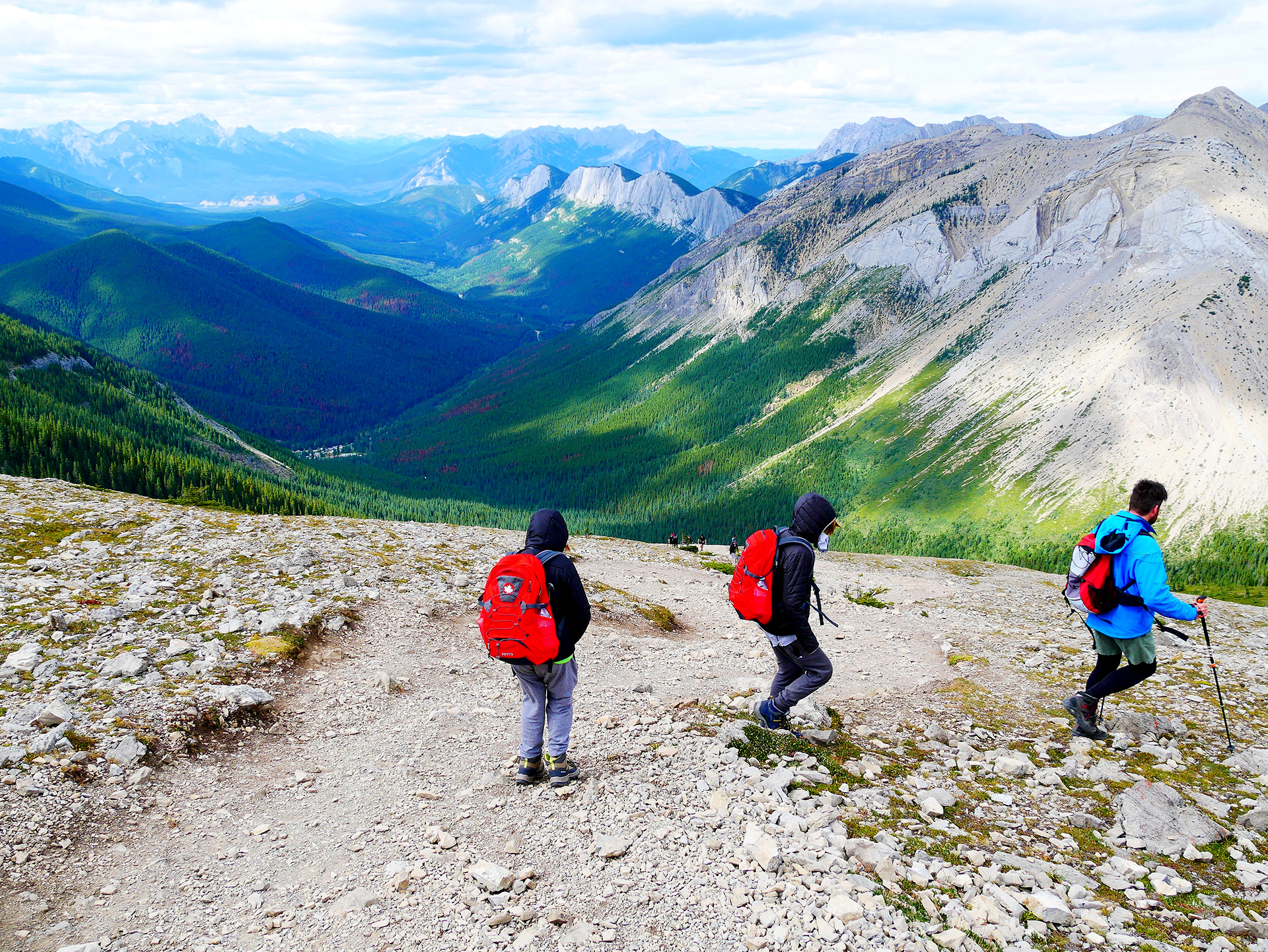 Da zum Wochenende auf dem Gregg Lake Campground alle Sites vorreserviert waren, wechselten wir heute auf den Cache Lake Campground ganz in der Nähe, fuhren aber, nachdem wir bezahlt hatten, direkt weiter zurück in den Jasper National Park nach Miette Hotsprings (ca. 60 km vor Jasper) und parkten hier. Von hier aus starteten wir zum Sulphur Skyline Trail, eine wundervolle Wanderung, die uns für die letzten beiden Tage entschädigte! Auf einer Länge von ca. 8 km ging es ca. 700 Höhenmeter hinauf auf den Sulphur Ridge. Bei den heißen Quellen war noch irre viel los, aber als wir die ersten Kilometer hinter uns hatten, mussten wir nur noch sehr selten Leute vorbeilassen. Wir waren auch nicht gerade früh dran, sodass uns einige Wanderer schon wieder entgegen kamen. Der Aufstieg führte uns zuerst durch Wald, dann unter freiem Himmel steil über Geröll zum Grat hinauf, wo wir mit einem gigantischen 360°-Rundumblick belohnt wurden. Während es unten noch recht windstill war, herrschte hier oben ein stürmischer und eisiger Wind. Aber der Ausblick war einfach unglaublich und wir kauerten uns windgeschützt hinter einen Felsen und stärkten uns mit den mitgebrachten Köstlichkeiten.