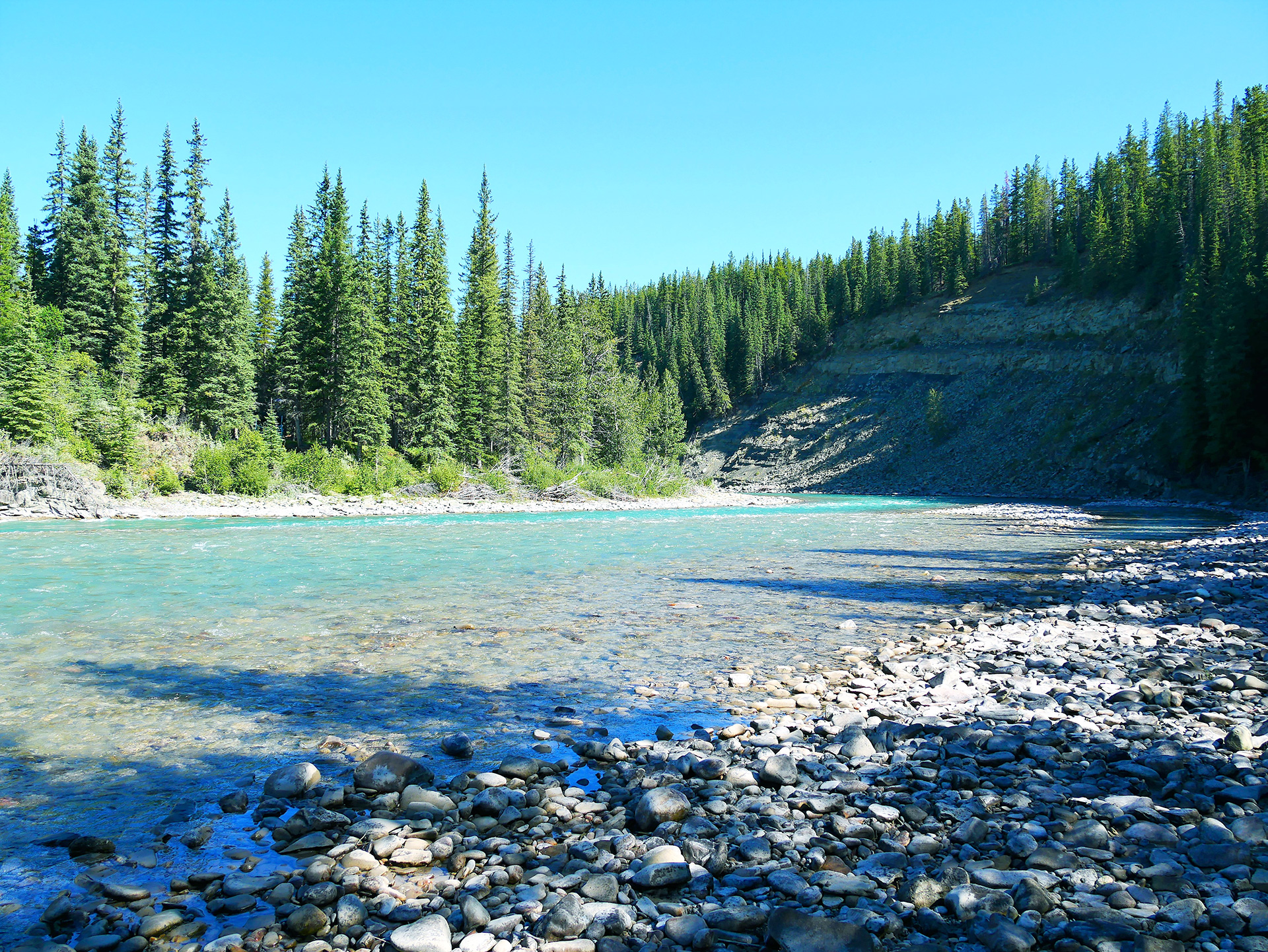 Nachdem wir uns die Bäuche vollgeschlagen und lange mit Chuck gequatscht hatten, fuhren wir weiter. Heute wollten wir nur ein kurzes Stück fahren, bis zum Brazeau River Campground. Wir waren aber offensichtlich so vertieft in unsere immerzu während der Fahrten laufenden Karl May Hörspiele, dass wir es geschafft haben, aus Versehen von der 734 auf die Elk River Road Richtung Lodgepole abzubiegen und dort total verblendet ca. 100 km (Gravel Road!) in der falschen Richtung zurückzulegen. Unfassbar! Wir mussten die komplette Strecke wieder zurück und brauchten natürlich viel länger als geplant. Der Brazeau River Campground am Fluss war super schön, und wir waren happy, als wir endlich ankamen.