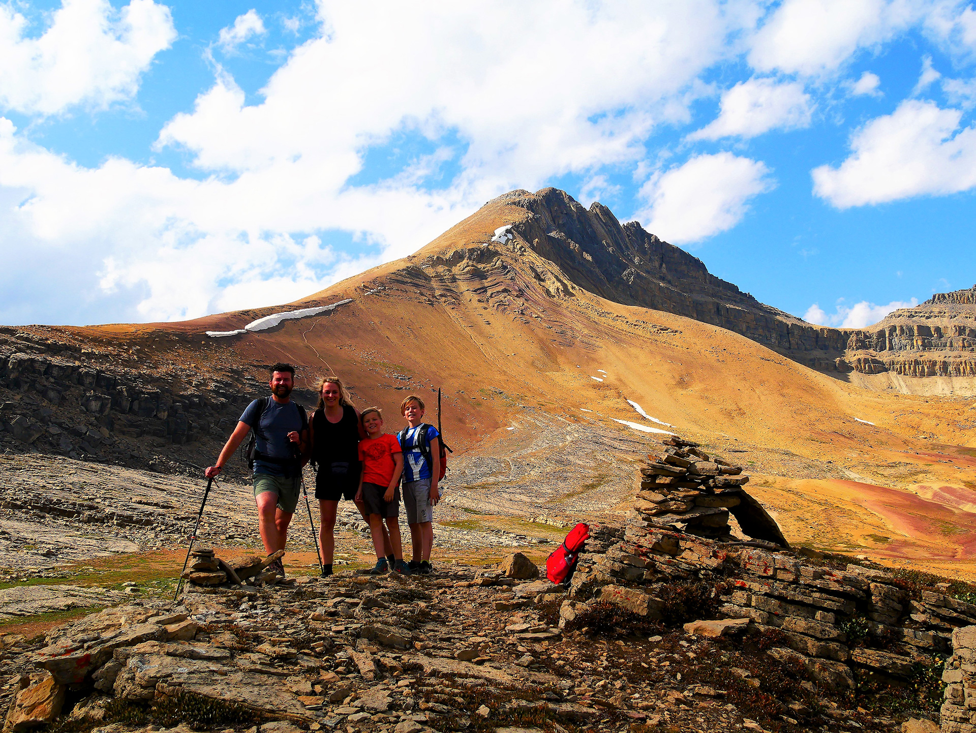 Der Helen Lake Trail startet an einem Parkplatz ca. 37 km nördlich von Lake Louise. Die Wanderung ist ca. 12 km lang und führt über 460 Höhenmeter hinauf zum Helen Lake. Laut Wanderführer - und das können wir jetzt bestätigen - eine der schönsten Touren im Banff Nationalpark. Der Trail führte uns zunächst einige Kilometer durch ein Waldgebiet, nach rechts hat man immer wieder atemberaubende Aussicht auf die gegenüberliegenden Gletscher. Nach einiger Zeit windet sich der Weg links um den Berghang und führt mit einem Wahnsinns-Panorama (unter anderem dem dramatischen Ausblick auf die Dolomite Peaks) durch bezaubernde, märchenhafte Wildblumenwiesen und vorbei an Bergseen, über herabrinnende Bäche bis zum wunderschönen Helen Lake. Es ist spektakulär! Während unserer Rast am See wurden wir durch ein drolliges Marmot (Murmeltier) überrascht, welches sehr neugierig war und sich relativ nah an uns herantraute. Obwohl es nicht mehr früh war (für die Wanderung sind insgesamt vier Stunden vorgesehen), konnten wir angesichts der unglaublichen Schönheit dieser Tour nicht genug kriegen und stiegen weiter auf, rechts am See vorbei auf die nächste Ebene, um über den nächsten Grat zu schauen. Ganz schöne Kletterei am Schluss, aber die Jungs waren tapfer und machten mit. Oben angekommen, tat sich eine neue umwerfende Aussicht auf und links von uns sahen wir ein kleines Schneefeld unterhalb des Berghangs am Cirque Peak. Die Jungs schrien nur „Schnee“ und rannten mit neuer Energie über die Ebene zum doch recht weit entfernten Schneefeld. Wir trabten hinterher und konnten es auch jetzt nicht lassen: Wir erlaubten den Jungs, auf dem Schnee noch ein bisschen zu spielen und herumzurutschen, während wir den sehr steilen Hang auf den Grat zum Cirque Peak hinauf kletterten. Oben angekommen, waren wir rechtschaffen fertig und gingen den Grat nur noch ca. 200 Meter weiter hinauf, um uns dann kurz zu setzen und den unfassbar schönen Ausblick zu genießen. Ein Komplettaufstieg auf den Cirque Peak wäre zwar von hier aus kein Drama mehr gewesen, wir waren nicht mehr weit entfernt, aber es war uns bereits weiter unten von Wanderern versichert worden, dass die Aussicht oberhalb des Grats, den wir überwunden hatten, einmalig und nicht mehr zu toppen wäre. Wir waren auch außer Sichtweite unserer Jungs, denen wir versprochen hatten, nicht mehr allzu weit zu gehen.