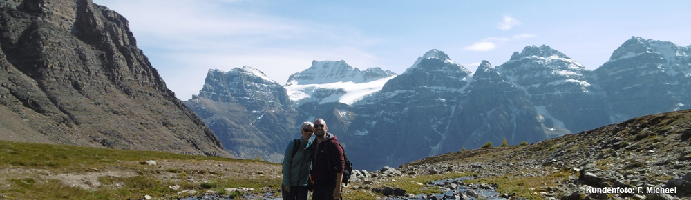 Heute besuchen wir den nicht ganz so heimlichen Star des Banff Nationalparks. Der Moraine Lake soll ja mittlerweile schon beliebter sein als Lake Louise und das bekommen wir auch zu spüren. Aufgehalten vom kaum vorhandenen Wasserdruck auf dem Frischwasserschlauch und vom fehlenden Wasser an der Dumpingstation erreichen wir den See viel zu spät. Alles vollgeparkt! Aber zum Glück sind wir ja in einem hybriden Auto unterwegs und parken ganz frech abseits der RV Parkplätze. Heute wollen wir auf dem Sentinel Pass Trail wandern und hoffen, geneigte Mitwanderer zu finden, denn hier ist wirklich Grizzlygebiet und das Wandern in Gruppen unter vier Leuten verboten. Zum Glück treffen wir ein Paar wieder, das schon auf dem Mount Whistler ein Foto von uns geschossen hatte. Annika und Gus aus London wandern mit uns. Es geht hinauf durch dichten Wald bis zu einer Ebene mit grandioser Aussicht auf die Ten Peaks. Dann weiter durch einen Märchenwald aus Larch Trees, die jetzt in voller gelber Prachtstehen. Oben angekommen erwartet uns ein alpines Tal mit zwei schönen Seen und der Rest des schmalen Trails an der Felswand entlang. Am höchsten Punkt des Trails genießen wir die Aussicht auf das Paradise Valley und die Berge und sind stolz auf die 725 geschafften Höhenmeter. Auf dem Weg nach unten rutsche ich aus und fast den Abhang runter. Das ist gerade nochmal gutgegangen. In Deutschland hätte dieser Trail bestimmt ein Geländer und 100 Warnschilder. Aber kanadische Trails sind eben ohne doppelten Boden und das gefällt uns auch sehr gut. Auf dem Abstieg wird's nochmal sehr anstrengend für die Knie und dann sind wir schon zurück am Ufer des Moraine Lake. Wir verabschieden uns von unseren tollen Wanderpartnern und fahren über den Bow Valley Parkway Richtung Banff. Wir erwarten, dass jeden Moment ein Grizzly aus dem dichten Wald am Straßenrand auftaucht. Das würde uns jetzt auch viel besser gefallen als noch vor ein paar Stunden auf dem Trail. Aber Meister Petz macht sich leider rar und auch der Johnston Canyon CG ist schon geschlossen, deshalb fahren wir direkt nach Banff. Leider entpuppt sich der Tunnel Mountain Village CG als hässlichster der Reise, in Reih und Glied stehen die RVs hier auf Asphalt. Am störendsten finde ich aber die Nachtbeleuchtung, die den letzten Rest Wildnisfeeling noch zunichtemacht. Wenigstens muss man sich hier aber nicht vor nächtlichen Bärenübergriffen gruseln. Oh, und noch etwas stößt uns an dem Campground sauer auf. Schon in Jasper und Lake Louise war uns aufgefallen, dass beim Einchecken nach unserer Herkunft gefragt wurde. Wir hatten das bis jetzt für statistische Notwendigkeit gehalten, aber hier sind wir tatsächlich nur von Deutschen umgeben, während ein paar "Straßen" weiter ausschließlich Englisch gesprochen wird. Zufall? Wohl kaum. Wir wittern Verrat und finden diese Praxis, sollte sie denn wirklich existieren, einfach nur erschreckend. Das schöne Bergpanorama, eine saubere Dusche und die warme Nacht am Lagerfeuer können uns aber etwas besänftigen. Trotzdem werden wir die Zelte hier morgen wieder abbrechen.
