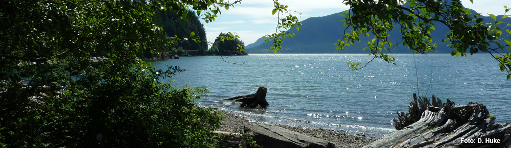 Am nächsten Morgen mache ich Bekanntschaft mit den Hirschen, die den Campground bewohnen und die Büsche an unserer Site für ihr Frühstück auserkoren haben. Sie sind so gar nicht scheu und beobachten neugierig, wie ich auf kleinen Pfaden in den Klippen herumwandere und schließlich meinen Weg zum Seeufer finde. Ich setze mich im Nieselregen in den Sand und genieße Stille und Einsamkeit. Bald stößt Felix dazu und nach einem ausgedehnten Frühstück mit Meerblick brechen wir auf. An Kelowna fahren wir nur vorbei, da wir den letzten Tag in Ruhe auf einem schönen Campground nahe Vancouver verbringen wollen. Die Landschaft ändert sich mit zunehmender Entfernung zum See, es wird hügeliger und die Wolkendecke hängt tief über unseren Köpfen. Zwischen Merritt und Hope haben uns die Coast Mountains wieder, ein schöner, runder Abschluss unserer Reise, die zwischen Meer und Bergen begonnen hatte.