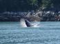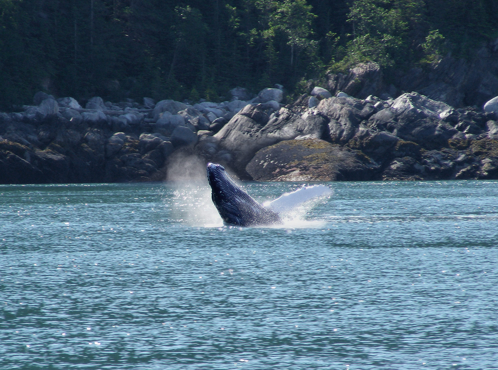 Plötzlich sehe ich eine Fontäne im Wasser. Kurz darauf springt ein Buckelwal fast mit seinem ganzen Körper aus dem Wasser. WOW!!! Wieder wird das Boot langsamer und bleibt in der Nähe. Tatsächlich bricht der Wal kurz darauf wieder durch die Wasseroberfläche. Und dann ein zweiter! Echt gigantisch! Wir sehen den Walen eine ganze Weile zu, bevor das Boot sich wieder auf den Weg nach Juneau macht.