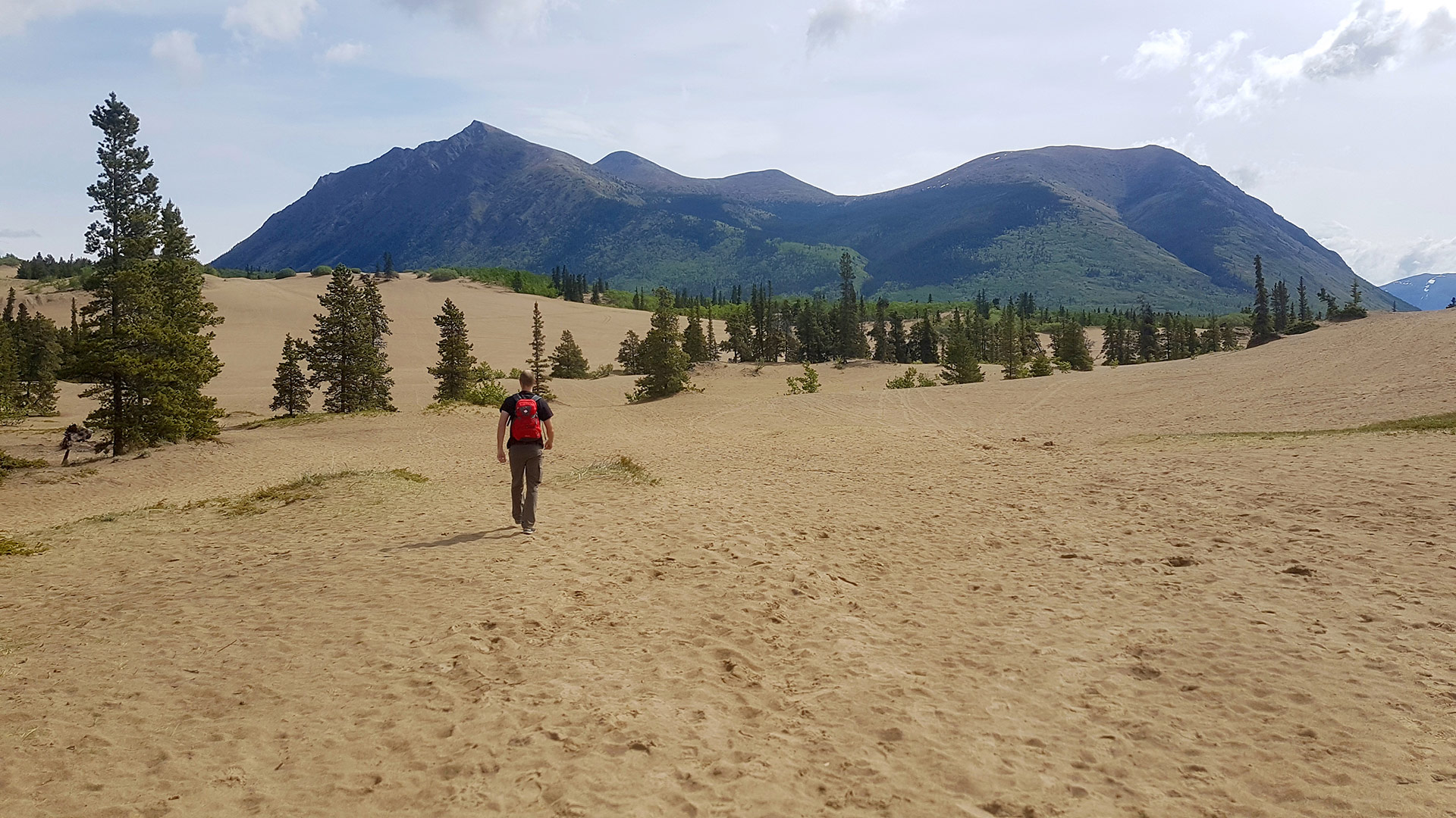 Am nächsten Morgen geht’s wieder früh ins Auto. Auf dem Klondike Highway fahren wir über Whitehorse nach Carcross. Auch diese Strecke ist ein echter Scenic Drive. Auf dem Weg sehe ich am Straßenrand einen Schwarzbären mit zwei Jungen im Wald verschwinden. Wow! Zwischenstopp am türkisfarbenen Emerald Lake, einem der berühmtesten Postkartenmotive im Yukon. Dann weiter zur Carcross Desert, der kleinsten Wüste der Welt. Der Gletscher-Sand wird vom Ufer des Lake Bennett durch den Wind hierher getragen. Das trockene Klima der Region tut sein übriges. Ich wandere etwas herum. Schon irre, im Norden Kanadas plötzlich nur noch von Sand umgeben zu sein. Wir erreichen Carcross, ein kleines Örtchen mit authentischer Goldgräber-Atmosphäre. Ich schlendere über die schöne Holz-Promenade mit kleinen Läden, die lokale Produkte und Kunst der First Nations anbieten. Im Matthew Watson General Store, dem ältesten aktiven Laden im Yukon, kaufe ich mir ein riesiges Eis, das ich am großen Sandstrand des Lake Bennett genieße. So lässt sich's leben.