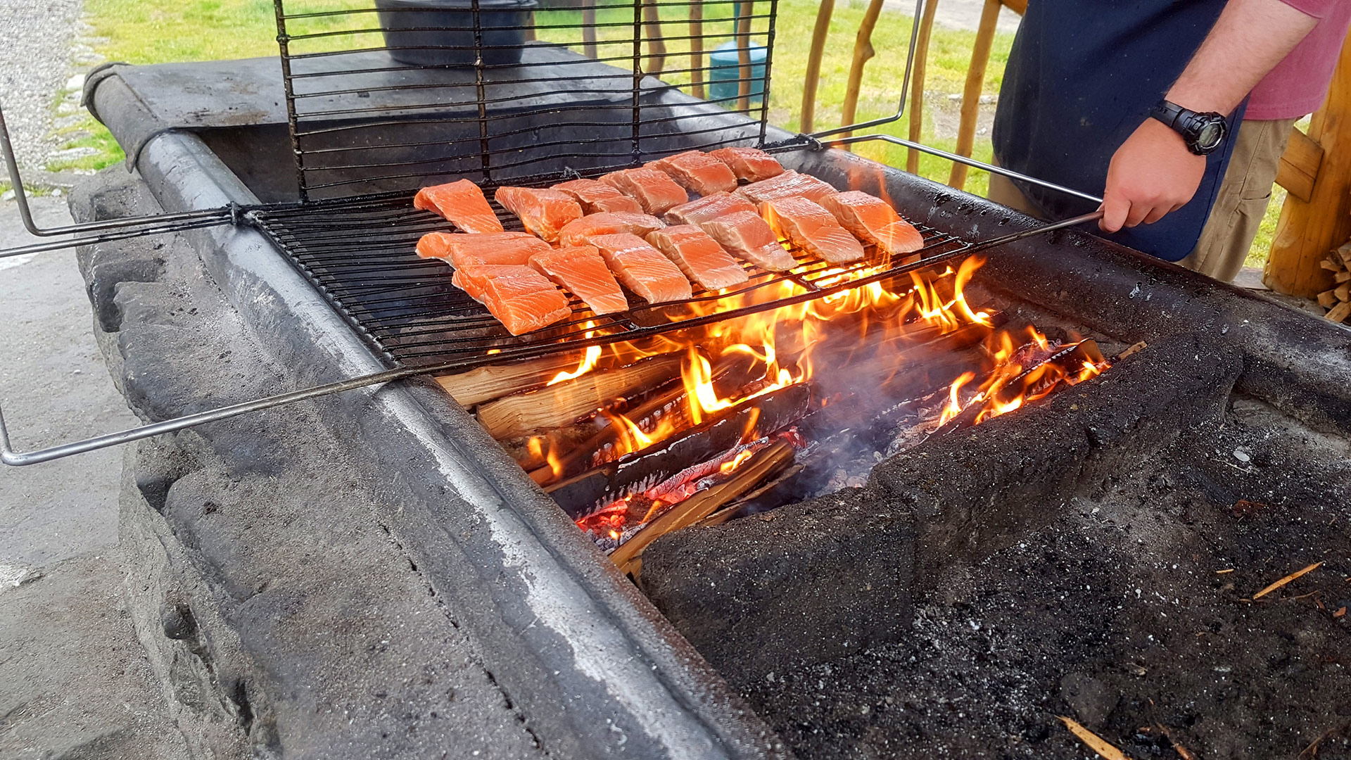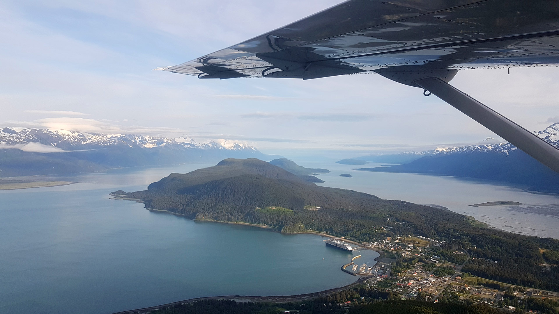 Zum Dinner besuchen wir die Jewell Gardens. Nach einem Rundgang durch die Gärten und die Glasbläserei gibt es im Restaurant leckere Lachs-Panini, Salat mit selbst angebauten Zutaten und himmlische Desserts. Dann geht es mit einem kleinen Propellerflugzeug weiter nach Haines. Wir sind etwa eine Minute zu spät am Airport. Da wir die einzigen Passagiere sind, hat der Pilot glücklicherweise auf uns gewartet. Check-In, Security, Gepäckaufgabe in ingesamt einer Minute – Rekord! Dann heben wir ab und fliegen in die Abendsonne. Vorbei an schneebedeckten Bergen, über den Fjord und über das Flussdelta des Chilkat River. Bis zur Landung vergehen nur 10 Minuten, aber die Ausblicke sind unvergesslich. Unsere Unterkunft in Haines ist das Hotel Halsingland. Das Hotel besteht aus mehreren ehemaligen Soldaten-Wohnhäusern auf dem ehemaligen Fort Seward Militärgelände. Hier gibt es geräumige Zimmer, tolle Ausblicke zum Meeresarm und ganz viel historischen Charme.
