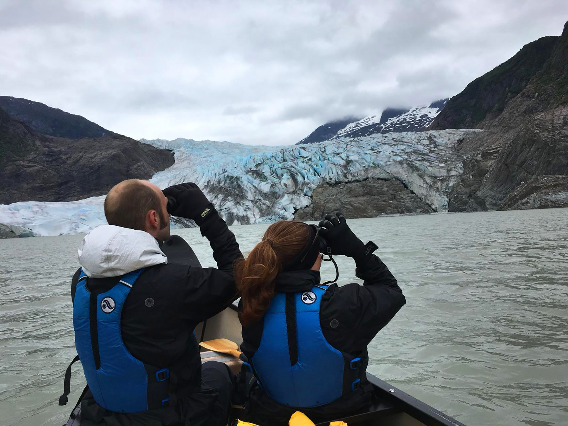 Am nächsten Morgen fahren wir nach einem ordentlichen Full American Breakfast Buffet im Ramada Hotel in den Tongrass National Forest – den größten Nationalforst der USA – zum Mendenhall Lake. Unser Guide von Liquid Alaska Tours wartet bereits mit Gummistiefeln, Schwimmwesten auf uns. Schnell umziehen, dann runter zum See. Wir wollen mit einem großen Voyager-Kanu bis an den Fuß des Mendenhall Gletschers paddeln. Schon von weitem ist die Eismauer zwischen den Bergen echt beeindruckend, doch erst wenn man näher kommt wird einem die tatsächliche Größe bewusst. Im Wasser treiben einige Eisberge, die unwirklich blau leuchten. Wir paddeln vorbei an einem breiten Wasserfall. Auf den Bergen erkenne ich mit dem Fernglas einige Bergziegen. Genial!