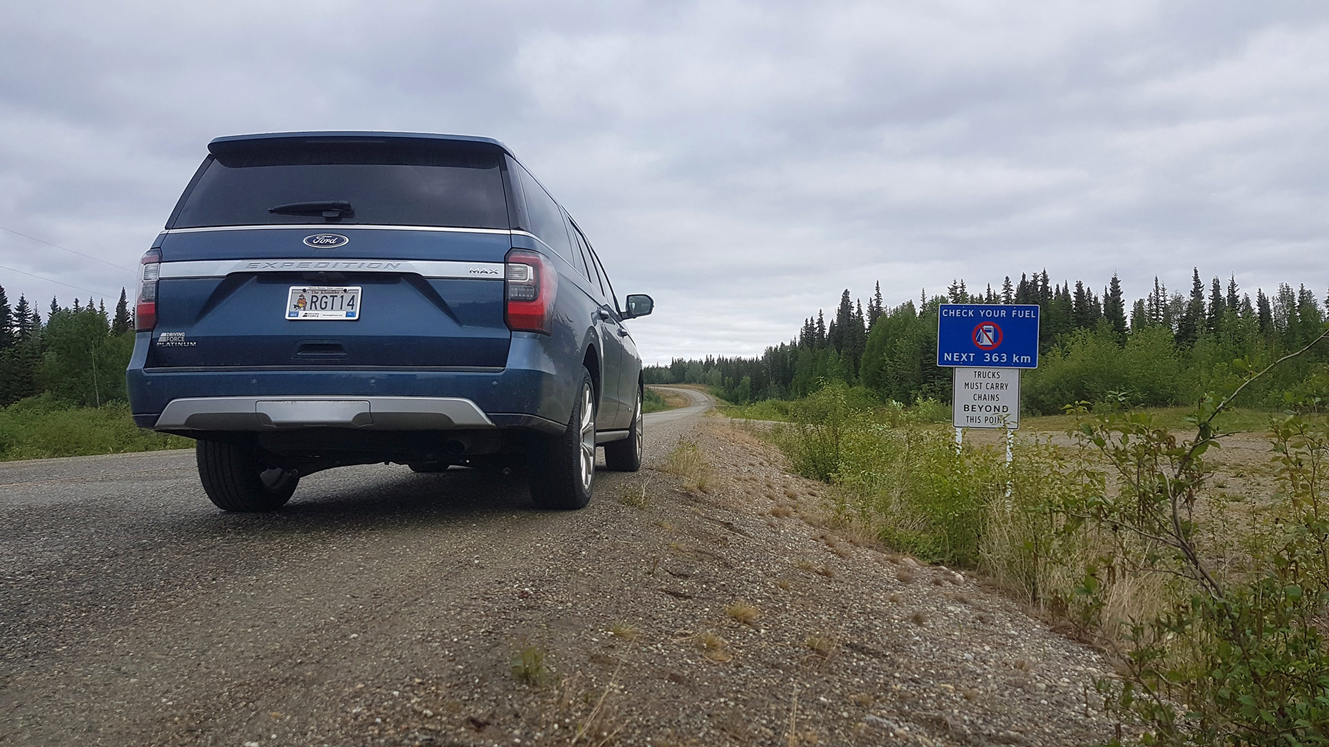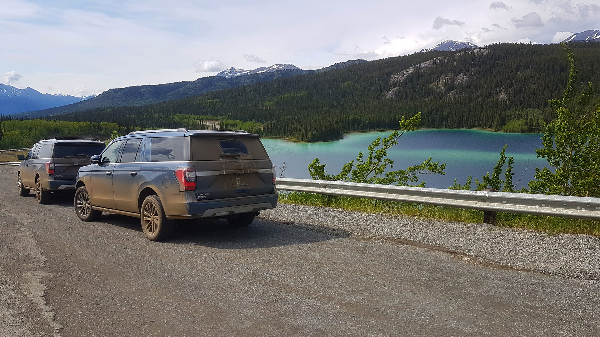 Den folgenden Tag sitze ich fast die ganze Zeit am Steuer. Doch auf dem Robert Campbell Highway ist das alles andere als reines Kilometerschlucken. 584 Kilometer von Watson Lake nach Carmacks – das meiste davon eine Schotterpiste. Da machen sich die großen Allrad-SUVs bezahlt. Am Ortsausgang von Watson Lake steht ein Schild: „Check your fuel – Next Gas Station in 363 km“. Klingt nach Abenteuer! Die Landschaft links und rechts wird immer wilder und spektakulärer. Vor uns Berge, Wälder und Wildnis – soweit man sehen kann. Hinter uns eine dichte Staubwolke. Und das stundenlang. Einfach gigantisch!