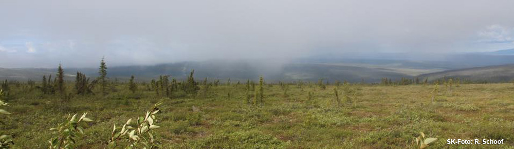 Zurück in die Wildnis: Rainers Yukon/NWT-Trip (Juni 2015) - Tag 4: Dempster! Spektakuläre Fahrt durch den wilden Yukon (Fortsetzung)Kurz vor dem Abstieg von den Eagle Plains tauchen in der Ferne die nördlichen Ogilvie Mountains auf. Mächtig. Beeindruckend. Wie gemalt thronen sie da über dem endlosen, tiefgrünen Flusstal des Peel River. Immer wieder muss man sich vergegenwärtigen, dass da unten wirklich nichts ist außer Wildnis. Kein Haus, keine Siedlung. Vielleicht irgendwo die Überreste einer alten Trapperhütte. Ach, es ist schon ein Traum! Davon werde ich nie genug bekommen! Leider hüllen sich die entfernten Gipfel in eine Wolke, als wir den Ogilvie-Peel-Viewpoint erreichen. Sicherlich wäre dies sonst ein toller Ort für herrliche Landschaftsfotos gewesen. Aber schon wenig später beim Abstieg von den Eagle Plains verzieht sich die Wolke und wir bekommen noch unser Bergpanorama. Vielleicht von hier aus nicht optimal auf's Bild gebannt, aber immerhin.... [Rainer]