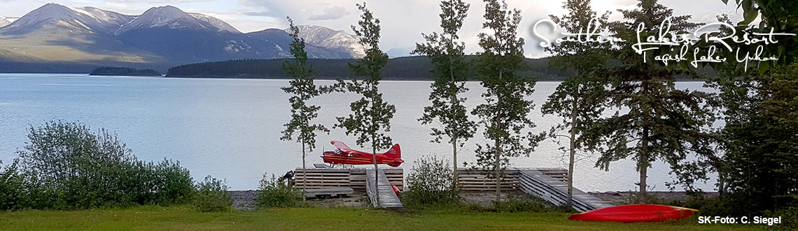 Am Flughafen treffe ich den Yukon-Experten Holger Bergold, der die Tour leiten wird – viele kennen ihn sicher von unseren Kanadatagen. Kurzer Check-In im Days Inn Hotel und dann direkt in den nächsten Flieger – und zwar in ein Floatplane von Alpine Aviation! Der Chef und Pilot Gerd ist ein alter Freund von Holger. Für viele Yukoner sind Wasserflugzeuge so selbstverständlich wie für uns ein Taxi. Für mich ist es allerdings eine Premiere. Die kultige rote DeHavilland Beaver aus dem Jahr 1949 hebt direkt auf dem Schwatka Lake ab. Der Start ist ruhiger, als ich gedacht hätte. Danach bin ich völlig geflasht von Weiten des Yukon. Endlose Wälder, der Yukon River, mächtige Berge, grün-blaue Seen. Echt atemberaubend! Am Ufer des Tagish Lake sehe ich erst einen Elch, dann einige Cabins. Wir landen auf dem See und machen das Flugzeug am Steg fest. Es fühlt sich an, als hätte man den riesigen See für sich allein. Betreiberin Sarah Stücker – ursprünglich aus der Schweiz – empfängt uns am Southern Lakes Resort & Restaurant. Sie zeigt uns die gemütlichen Standard Lakefront Cabins und die moderneren Deluxe Lakeview Villas mit Panoramafenstern zum See. Dann gibt’s im urigen Restaurant der Hauptlodge deftige Bison-Cheeseburger. Lecker! Der Rückflug nach Whitehorse ist genauso beeindruckend wie der Hinflug und um 10 Uhr Abends ist es noch taghell. Von oben entdecken wir unter anderem einen Schwarzbären und eine Bergziege. Trotzdem kann ich kaum noch die Augen offen halten. Der Tag war doch etwas länger, als ich es gewohnt bin. Im Hotel in Whitehorse angekommen falle ich erschöpft und zufrieden ins Bett.
