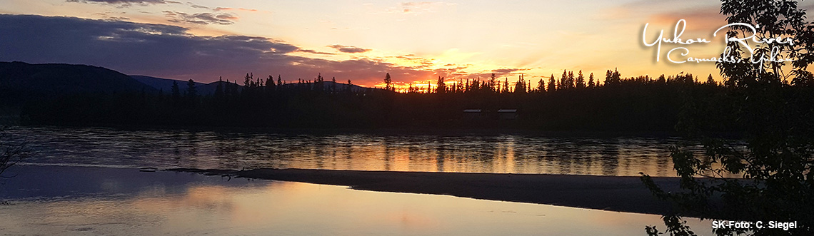 Abends erreichen wir Carmacks und damit das Ende des Campbell Highways. Dass unsere Mietwagen ursprünglich blau waren, lässt sich nur noch erahnen. Carmacks ist eine ehemalige Goldgräber-Siedlung direkt am Yukon River. Zum Dinner gehen wir ins Gold Panner Restaurant. Da es auch nach dem Abendessen noch taghell ist, machen wir noch einen Ausflug zu den Five Finger Rapids. Diese Stromschnellen sind vielen Goldsuchern zum Verhängnis geworden. Heute führt ein guter Wanderweg mit vielen Treppen zu einem tollen Aussichtspunkt. Ich sehe den Möwen zu, die über die Felsen kreisen. Irgendwie spannend, schließlich sind wir hier über 350 Kilometer vom Pazifik entfernt. Die Nacht verbringen wir im Carmacks Hotel mit schönen Zimmern, einer Bar und einigen einfachen Cabins. Der Yukon River ist nur wenige Schritte entfernt. Ich setze mich auf ein Stück Holz und genieße den Sonnenuntergang – kurz nach Mitternacht leuchtet der Himmel feuerrot. Fantastisch!