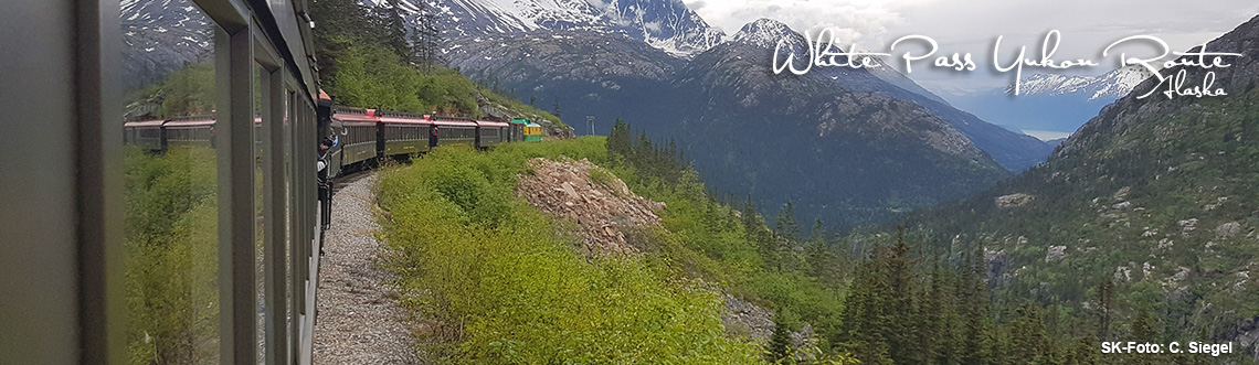 Vom Bahnhof in Carcross bringt uns die White Pass & Yukon Railroad nach Skagway. Goldsucher, die mit dem Schiff in Skagway (Alaska) ankamen, mussten mit einer Tonne Proviant mehrfach den White Pass überqueren, um über die kanadische Grenze zu kommen. Dieser beschwerliche Weg war damals auch als „Dead Horse Trail“ bekannt. “The horses died like mosquitoes in the first frost, and from Skaguay to Bennett they rotted in heaps,” schrieb Jack London. Entsprechend groß war die Nachfrage nach einer Eisenbahnstrecke, mit deren Bau dann 1898 begonnen wurde. Heute ist der Zug vor allem mit Touristen gefüllt. Kein Wunder – der Blick aus dem Fenster ist wirklich der Wahnsinn! Kleiner Tipp: Fährt man von Carcross nach Skagway, also nach Süden, sind die besten Plätze in Fahrtrichtung rechts am Fenster. In die andere Richtung gilt entsprechend das Gegenteil. Bei einer Rundtour ist die Platzwahl egal. Wir saßen im letzten Wagon, der zusätzlich den Vorteil einer freien Sicht nach hinten bietet. Unser Tourguide Juliana erzählt während der Fahrt Geschichten aus der Goldrausch-Zeit und kündigt besonders sehenswerte Ausblicke an – meistens mit sehr viel Humor. Von Carcross fährt der Zug zunächst am 41 Kilometer langen Lake Bennett vorbei. Währenddessen wird Lunch serviert: Sandwiches, Käse mit Trauben und Cookies. Beim Essen sehe ich auf einem Felsen neben den Gleisen einen Schwarzbären, der dem Zug interessiert nachsieht. Der erste Halt ist in Bennett, BC. Diese historische Siedlung ist nur mit dem Zug erreichbar und besteht aus dem Bahnhof, einer alten Kirche und einem alten Wohnhaus. Hier beginnt auch der Chilkoot Trail, ein ca. 50 Kilometer langer Wanderweg nach Skagway. Im Bahnhofsgebäude befindet sich heute ein Museum. Da der Zug nur eine Stunde Halt macht, will ich erst einmal den kleinen Wanderweg hoch gehen. Neben der historischen Kirche erwartet mich oben ein traumhafter Blick auf den Lake Bennett. Ich vergesse ein wenig die Zeit und muss mich plötzlich beeilen, um pünktlich zurück im Zug zu sein. Für das Museum bleibt leider keine Zeit. Richtig spektakulär wird es noch einmal am White Pass, wo der Zug zwei Tunnel, einige Brücken und extrem steile Berghänge passiert. In Skagway werden die Ausweise kontrolliert und die Einreiseformalitäten geregelt. Ein ESTA braucht man übrigens nicht, es kann aber durchaus hilfreich sein, um den Vorgang zu beschleunigen. Skagway hat viel historisches Flair und ist daher auch ein beliebtes Ziel für Kreuzfahrten. Bei unserer Ankunft liegen gleich zwei Schiffe in der Bucht.