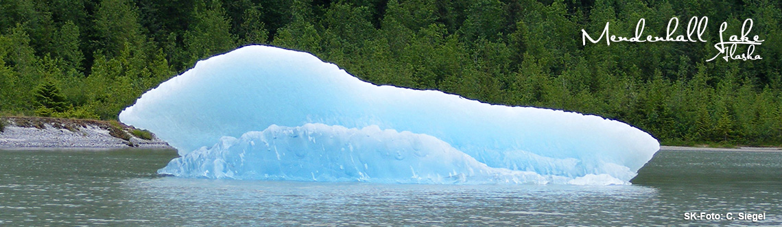 Am nächsten Morgen fahren wir nach einem ordentlichen Full American Breakfast Buffet im Ramada Hotel in den Tongrass National Forest – den größten Nationalforst der USA – zum Mendenhall Lake. Unser Guide von Liquid Alaska Tours wartet bereits mit Gummistiefeln, Schwimmwesten auf uns. Schnell umziehen, dann runter zum See. Wir wollen mit einem großen Voyager-Kanu bis an den Fuß des Mendenhall Gletschers paddeln. Schon von weitem ist die Eismauer zwischen den Bergen echt beeindruckend, doch erst wenn man näher kommt wird einem die tatsächliche Größe bewusst. Im Wasser treiben einige Eisberge, die unwirklich blau leuchten. Wir paddeln vorbei an einem breiten Wasserfall. Auf den Bergen erkenne ich mit dem Fernglas einige Bergziegen. Genial!