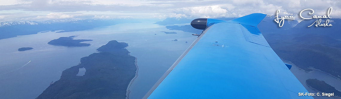 Wieder unten am Hafen treffen wir uns an der kleinen Holzhütte von Wings Airways. Hier startet unsere Fly'n'Dine Tour zur Taku Lodge. Ich steige in eines der drei DeHavilland Otter Wasserflugzeuge, dann heben wir ab. Die Aussicht ist der Hammer! Erst Juneau von oben, dann der Fjord, dann die riesigen Gletscherflächen des Juneau Icefield. Insgesamt fünf Gletscher liegen auf der Flugroute. Nach einem unvergesslichen Flug landen wir im Taku Inlet direkt vor dem Hole-In-The-Wall-Glacier. Hier erwartet uns eine gemütliche Lodge, direkt daneben liegen schon die Lachsfilets auf einem großen Barbecue Grill. Es bleibt etwas Zeit, die Umgebung zu erkunden, bis ein lauter Gong alle Gäste zum Essen in die Lodge ruft. Neben dem frischen Coho-Lachsfilet gibt es ein Buffet mit leckeren Beilagen. In urig-gemütlicher Atmosphäre genieße ich das Dinner am Kaminfeuer und schaue regelmäßig aus dem Fenster zum Grillplatz. Nicht selten sollen hier einige Schwarzbären herumschleichen, die gern den fischigen Grillrost ablecken. Heute scheinen sie allerdings keinen Appetit zu haben. Nach einer kurzen Wanderung durch den Regenwald fliegen wir zurück, wieder mit herrlichen Ausblicken auf den mächtigen Taku Gletscher. Später sehe ich aus dem Flugzeug eine Fontäne im Wasser des Fjordes. Auch der kurz darauf auftauchende Wal ist aus dieser Flughöhe deutlich zu erkennen. Wow!