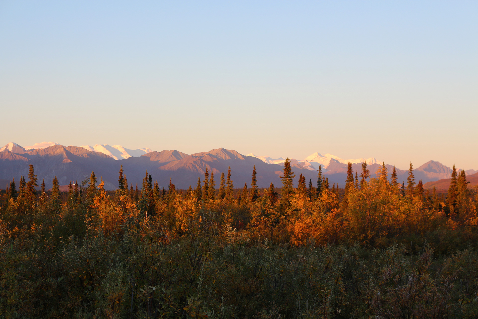 Dann ging's weiter wieder über Anchorage, Palmer auf den Glenn Highway. Da wir heute einiges fahren mussten und ja den ungeplanten Stop eingelegt hatten, fuhren wir bis in den Nachmittag hinein. Das Wetter hatte sich ja immer noch von seiner sonnigen Seite gezeigt und tauchte die Landschaft in ein schönes warmes Licht. Die Herbstfärbung ist nun auch nicht mehr zu übersehen und tut das übrige Schöne dazu. Als plötzlich der Matanuska Gletscher auftaucht, staunten wir nicht schlecht. Da auf dem Glenn Highway nicht so viele Campgrounds lagen, beschlossen wir heute wild zu campen und wurden ein Stück hinter dem Matanusca Gletscher auch fündig. Es war ein superschönes Plätzchen - sogar mit Feuerstellen und einer Traumkulisse vor der Bergkette.