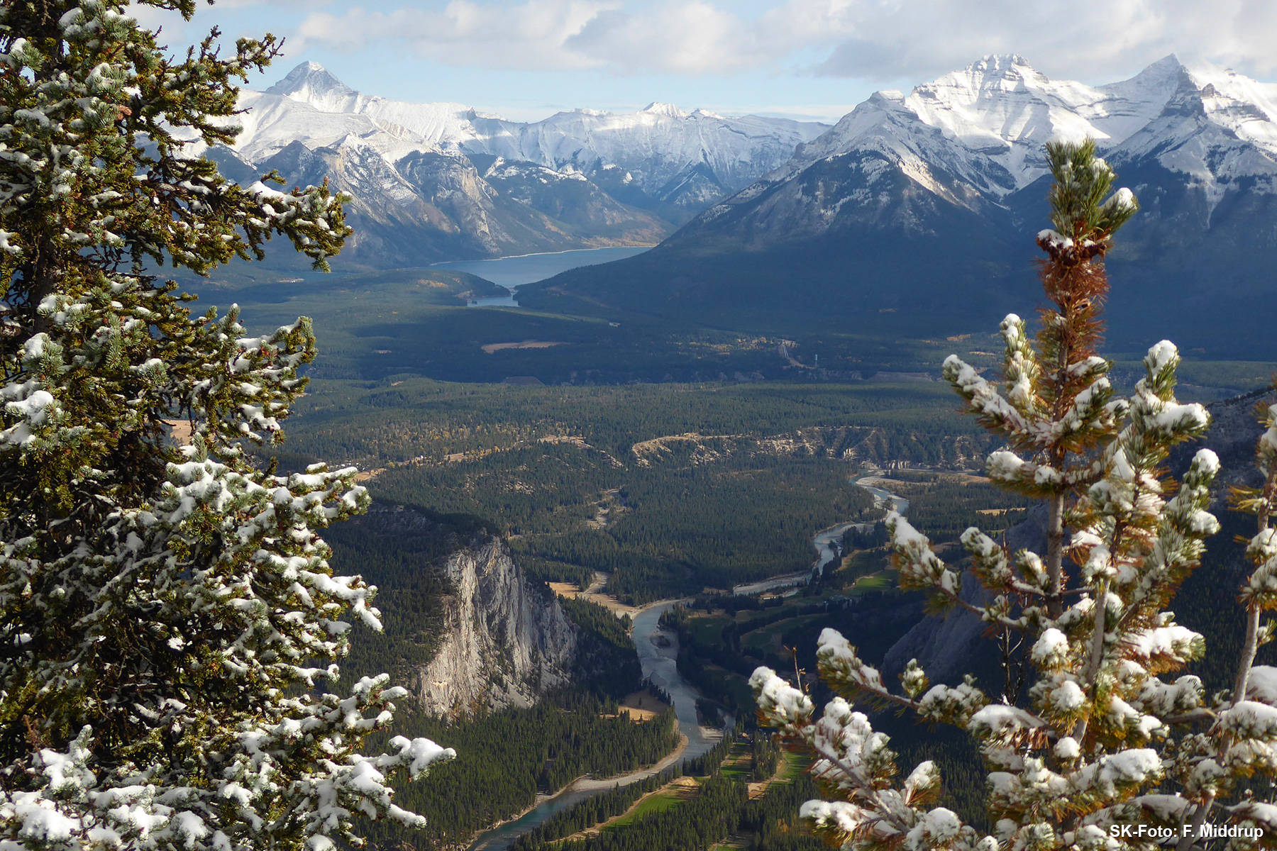 Heute geht es hoch hinaus. Mit der Banff Gondola fährst du auf den über 2000 Meter hohen Sulphur Mountain. Mit jedem Höhenmeter wird die Talstation etwas außerhalb des Ortes Banff kleiner und du näherst sich der Bergspitze. Von der Bergstation führen Holzstege entlang des Bergkamms und laden zu einem gemütlichen Spaziergang ein. Verschiedene Aussichtsplattformen ermöglichen den Blick auf das Städtchen Banff und die umliegende Region. Rund um dich herum erschließt sich das Bergpanorama der Rocky Mountains.