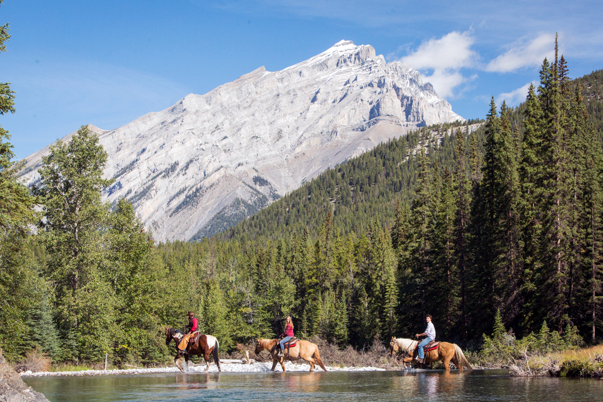 Reiten durch die Rockies! Von den Warner Stables aus nahe Banff folgst du den Cowboys zunächst am Bow River entlang. Dann reitest du über die Flanke des Sulphur Mountain mit atemberaubendem Ausblick auf das Flusstal. Der etwa zweistündige Ausritt ist sowohl für erfahrene Reiter als auch für Anfänger geeignet.