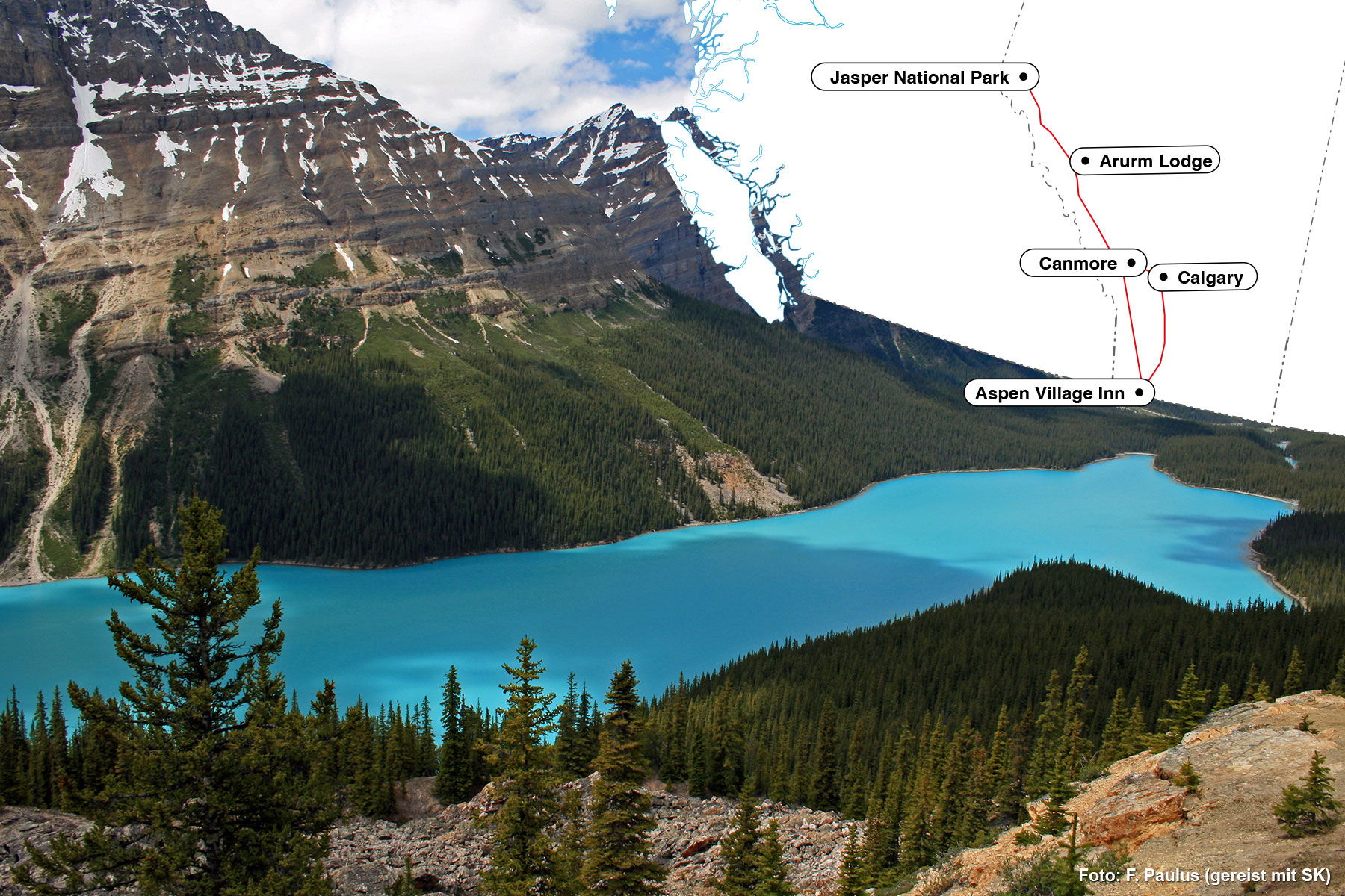 Das erste Highlight lässt heute nicht lange auf sich warten: der Peyto Lake, eins DER Fotomotive entlang der Strecke. Einige Kilometer danach verlässt du den Icefields Parkway für einen Abstecher zur Ostflanke der Rocky Mountains. Unweit der Ortschaft Nordegg befindet sich die Aurum Lodge. Auf einer Höhe von 1.350 Metern überblickt sie den türkisgrünen Abraham Lake und ist von Berggipfeln und Wäldern umgeben. Die Lodge zeichnet sich dadurch aus, dass sie ökologisch und nachhaltig geführt ist. Kommst du in einem der Lodge Rooms unter erwartet dich ein reichhaltiges Frühstück, und auch Abendessen ist inbegriffen. Möchtest du stattdessen unabhängiger sein und dir deine Mahlzeiten selbst zubereiten, bieten wir dir gern auf Nachfrage einen Aufenthalt in den Cottages oder im Apartment an. Entdecke tagsüber die Umgebung von Nordegg auf den über hundert Wanderwegen verschiedener Schwierigkeitsstufen. Hier ist es herrlich still und einsam – viele Strecken hast du ganz für dich. Bei der Planung deiner Ausflüge sind dir deine Gastgeber gern behilflich.
