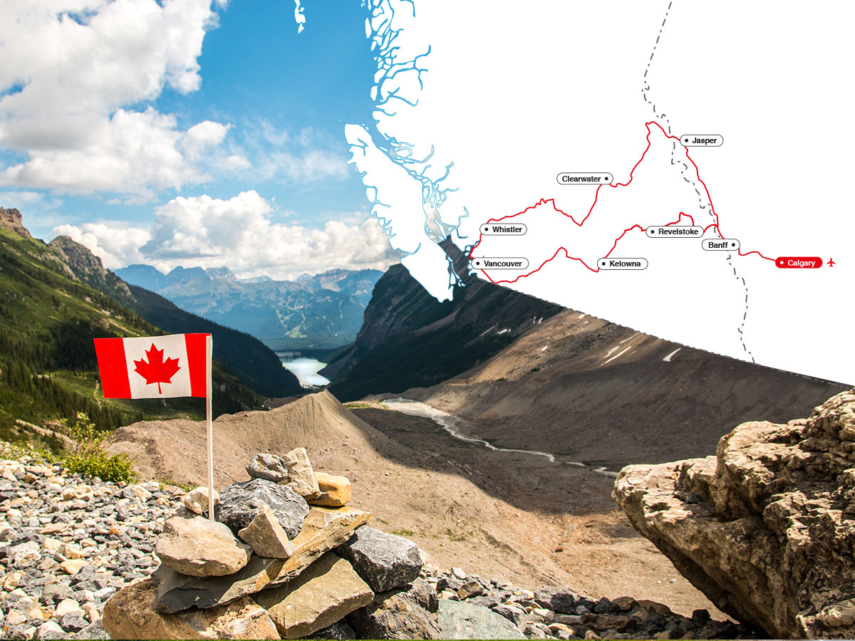 Die Route durchquert die Rocky Mountains auf dem Icefields Parkway und folgt ikonischen Naturparks und spektakulären Highway bis hinunter zum Pazifik. Zurück geht es durch das sonnenverwöhnte Okanagan Valley auf der Südroute gen Calgary.