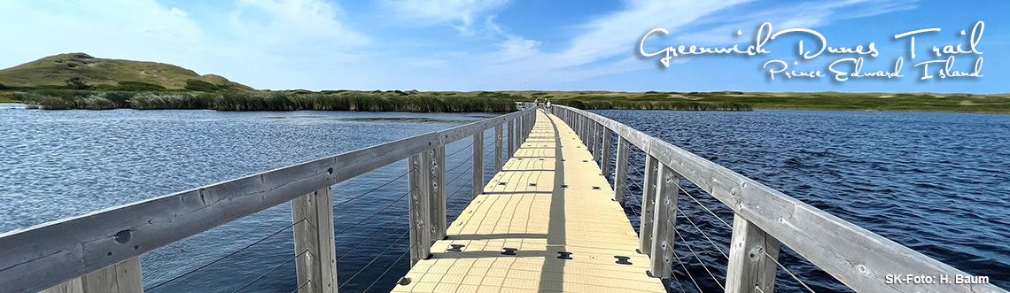 Füe eine außergewöhnlichere Wanderung solltet ihr unbedingt einen Stop im Prince Edward Island Nationalpark einlegen. Der „Greenwich Dunes Trail“ ist ca. 4,8km lang. Diese 4,8km sind allerdings echt spannend angelegt. Ihr startet auf Schotter und lauft durch landwirtschaftliche Felder, dann wechselt der Trail in ein Wäldchen. Das absolute Highlight in Richtung der Greenwich Dünen ist allerdings der „floating boardwalk“ über die Teiche und Seen entlang der Dünen. Ein bisschen läuft es sich hier, wie wenn man leicht betrunken ist, und gerade wenn viele Menschen unterwegs sind, kann es schon mal etwas mehr schwanken – macht aber unheimlich Spaß! Der Blick auf den Atlantik von den Dünen ist dann der krönende Abschluss.