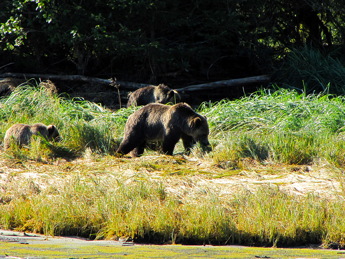 Fabelhaft. Unvergesslich. Atemberaubend. Unsere Grizzly-Tagestour ab Telegraph Cove auf Vancouver Island. Früh morgens geht es los. Ganz früh! Mit dem Motorboot aus der geschützten, kleinen Marina von Telegraph Cove durch den Irrgarten an kleinen, wilden Inselchen und hinein in die zerklüftete Küstenlandschaft des Festlandes. Die Sonne durchbricht den Frühnebel. Eine riesige Delfinschule (etwa 100 Tiere!) begleitet uns zeitweise. Das allein macht diesen Tag schon besonders für mich. Dann aber hinein in den Fjord. Herrliche Blicke auf Wiesen und Marschlandschaften. Da sind Sie, die ersten Bären - Jungtier mit Mutter. Hammer! Und fast ist es mir peinlich, das auch hinzufügen zu müssen: Auf dem Rückweg treffen wir auf eine Orca-Familie und driften eine ganze Weile mit ihr dahin - weil wir uns alle nicht sattsehen können. Was für ein sensationeller Tag! Was für eine tolle Tour.