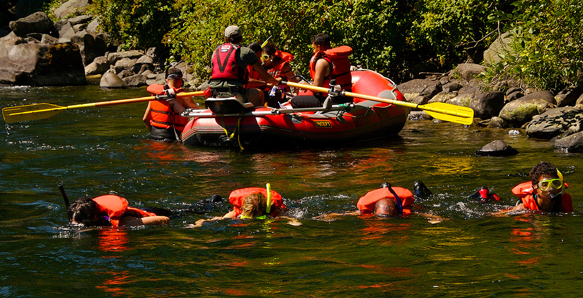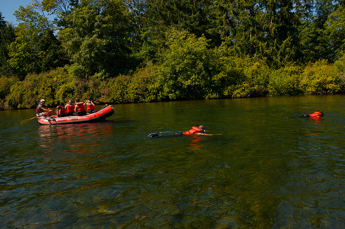 Das Gefühl grandios, die Erfahrung bleibend: Lachsschnorcheln auf Vancouver Island. Umgeben von gefühlt 1.000 Lachsen lasse ich mich im Campbell River treiben. Ganz ehrlich, die Fische sind riesig! Das wusste ich zwar, doch so ganz aus der Nähe ist das doch nochmal was anderes! Zu Beginn eine kleine Mutprobe: ein Sprung ins Wasser von einer knapp zwei Meter hohen Klippe, danach ab ins Raft und zwischendurch immer wieder der erfrischende Sprung ins Wasser zu den Lachsen! Tuchfühlung mit Chinook, Coho und Sockeye - ein Riesenspass. Nicht alltäglich!