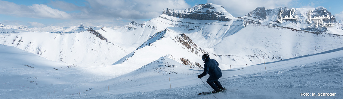 In ca. 45 Minuten Fahrt ist Lake Louise erreicht, das wohl bekannteste Skigebiet der kanadischen Rockies. Nicht zu unrecht, denn hier erstreckt sich ein ausgezeichnetes Netzwerk an Pisten und Geländeabfahrten, die von extrem einfach bis extrem schwer reichen. Die sog. Frontside ist fast völlig planiert. Die Back Bowls dagegen versprechen anspruchsvolle Abfahrten: “Glades”, Buckel, Rinnen, Klippen, Tiefschnee – was das Herz begehrt! Dazu kommt noch die überwältigende Aussicht auf den gefrorenen See, das Chateau Lake Louise und Mt. Victoria samt gleichnamigem Gletscher – der perfekte Platz für ein Erinnerungsfoto. Oder Selfie. Lake Louise lässt niemanden unberührt und hier können es bei Prachtwetter auch schonmal gut und gerne 8.000 Höhenmeter und mehr werden.