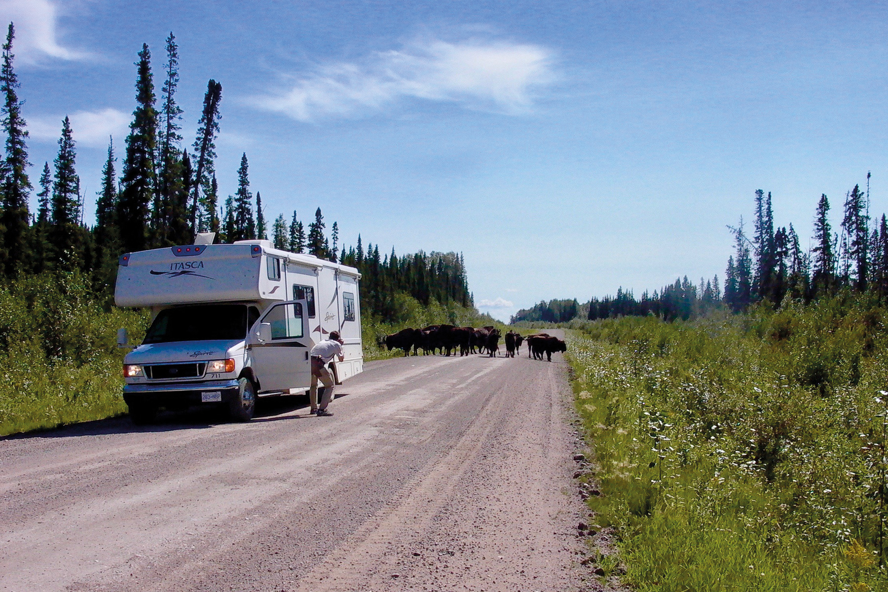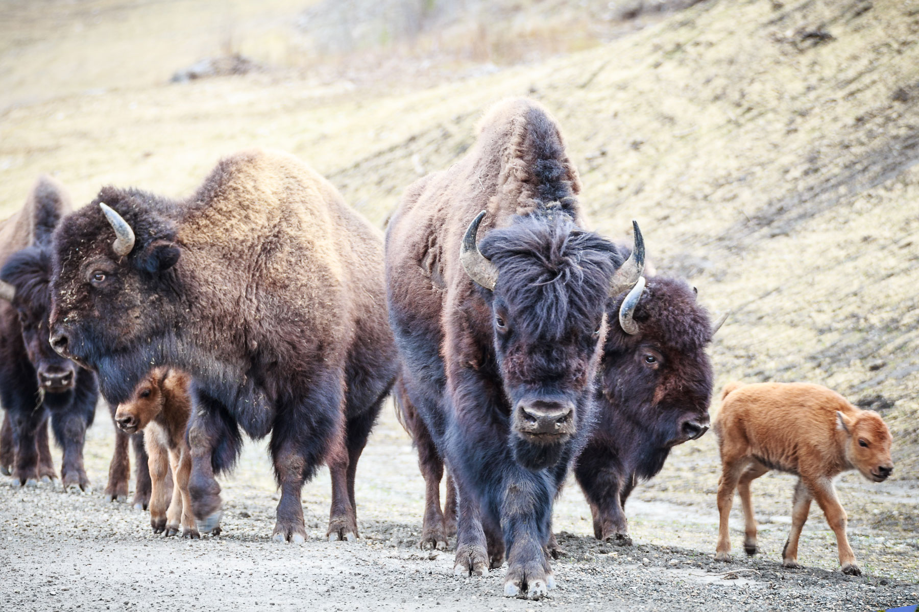 Bisons siehst du in designierten Bereichen kanadischer Nationalparks (wie Waterton Park, Prince Albert Park oder Elk Island Park) oder in völlig freier Wildbahn im Norden von British Columbia und Alberta sowie im Yukon und in den Northwest Territories. Dies sind dann in der Regel die Wood Buffalos und sie tauchen tatsächlich häufig aus dem Wald auf, um sich auf den auch für sie einfacheren und ohnehin ja wenig befahrenen Schotterpisten des Nordens fortzubewegen oder um auf den schmalen Wiesenstreifen zwischen Straße und Unterholz zu grasen.