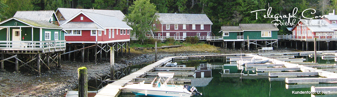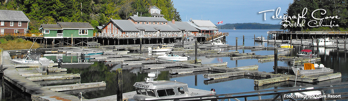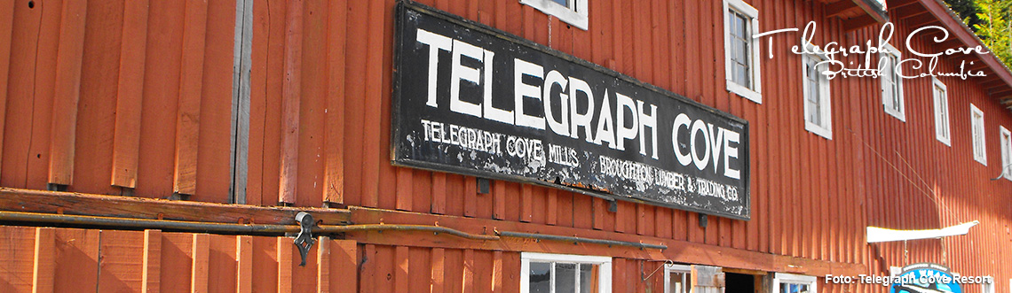 Vancouver Island, B.C.Telegraph Cove ist ein uriges Fischerörtchen im Norden Vancouver Islands – bestehend aus Holzhäusern, die größtenteils auf Pfählen um einen zentralen Steg angeordnet sind. Seinen Namen hat der Ort von einer Telegraphenstation, die 1911 in der Bucht eingerichtet wurde.