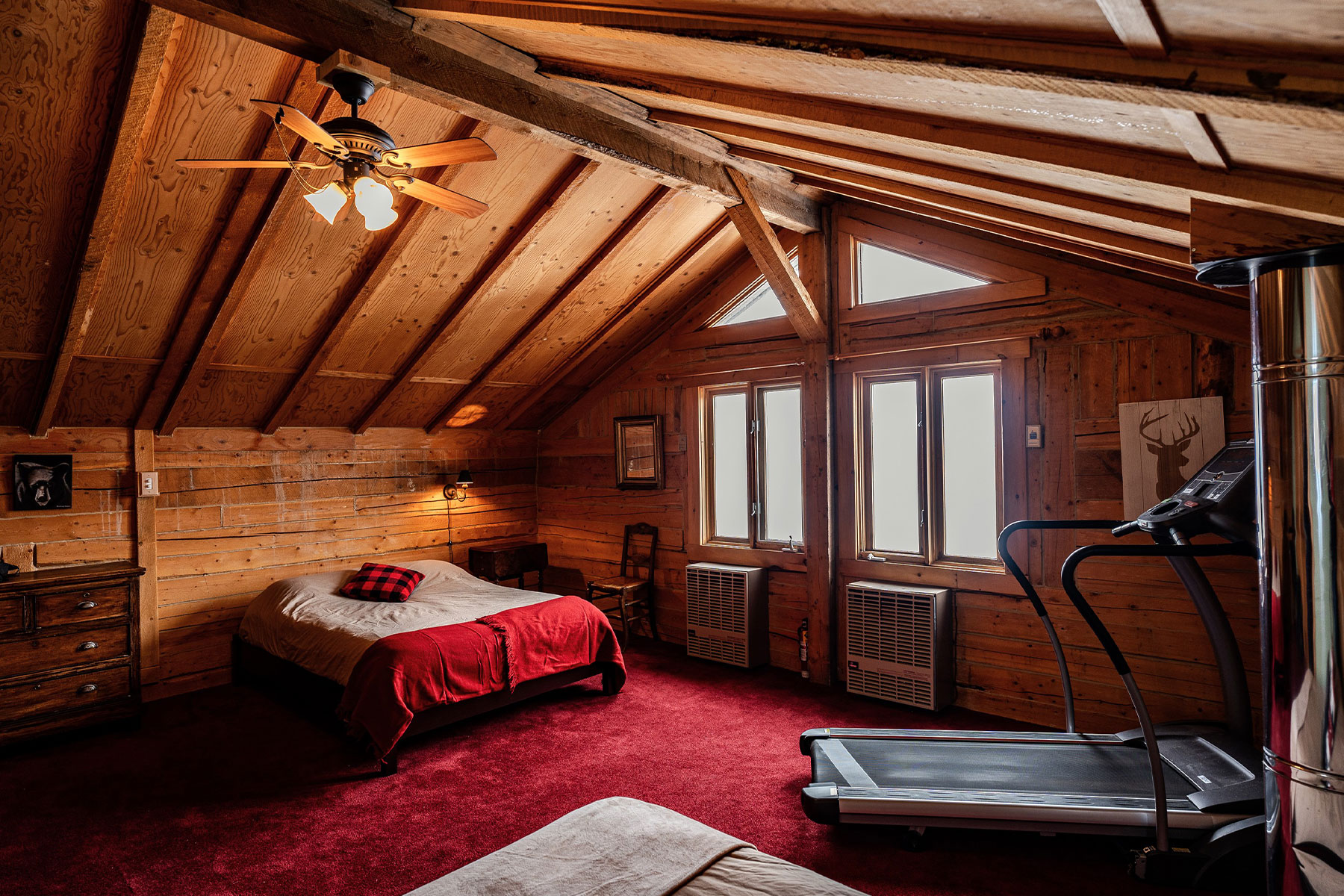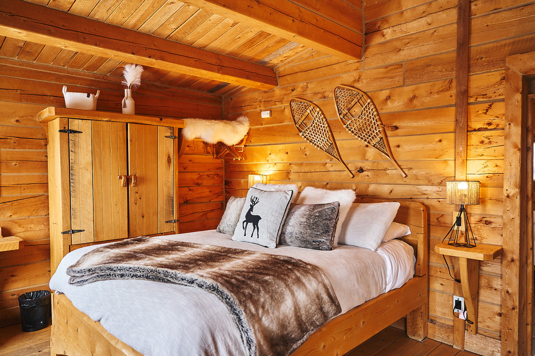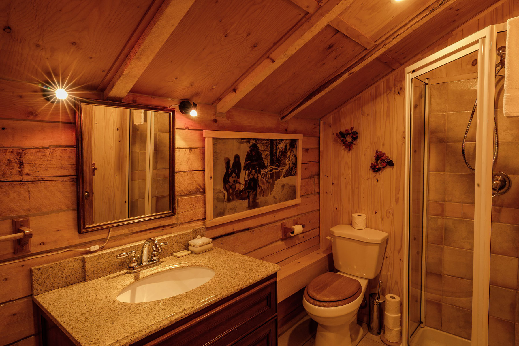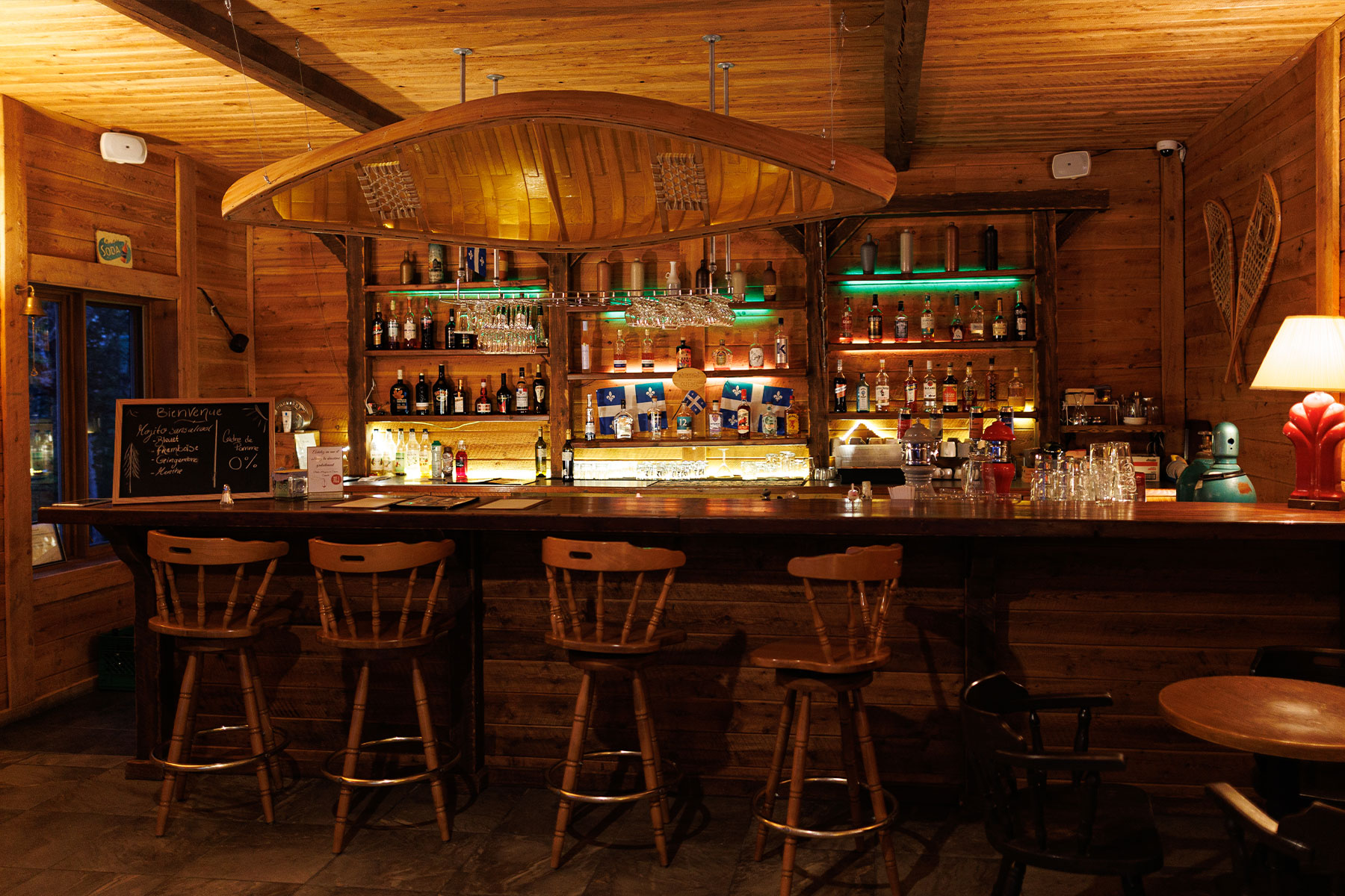 Das Anwesen besteht aus mehreren Gebäuden, die sich auf dem bewaldeten Grundstück verteilen. Das Restaurant und die Bar befinden sich im Naskapi Chalet. Beginne hier den Tag mit einem typisch kanadischen Frühstück. Abends kannst du ein schmackhaftes Dinner genießen. Die 46 Gästezimmer mit Bad verteilen sich auf sechs Häuser, die über einen gemütlichen Aufenthaltsraum verfügen. In allen Gebäuden gibt es WLAN-Zugang.