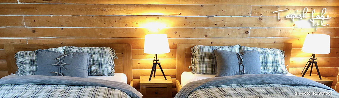 Der Zufahrtsweg ist – ganz Yukon-typisch – eine Schotterstraße. Und das Resort insgesamt ein richtiges Yukon-Träumchen: Die fünf traditionell-gemütlichen Standard Lakefront Cabins mit 1-2 Doppelbetten liegen nah am Ufer und haben eine kleine Terrasse zum See hin. In den moderneren Deluxe Lakeview Villas mit Panoramafenstern kann man sogar vom Bett aus die eindrucksvolle Kulisse zu genießen – im Winter auch regelmäßig mit Nordlichtern. Sie bieten Platz für zwei Erwachsene und ein Kind. Darüber gehört auch eine Familien-Cabin mit Küchenzeile und einem zweiten Schlafzimmer mit zwei Einzelbetten zum Resort. Alle Cabins haben ein eigenes Bad mit WC und Dusche.