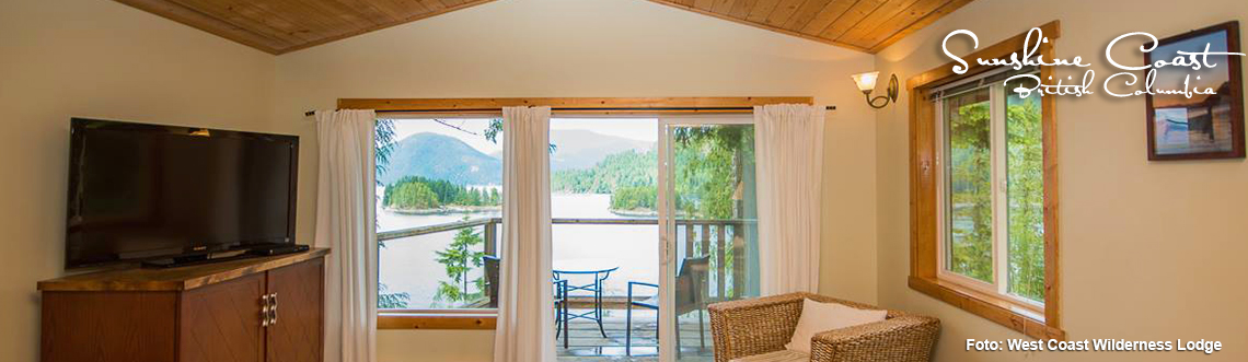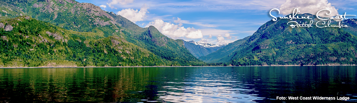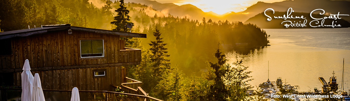 Sunshine Coast, B.C.Die Sunshine Coast! Erlebe die einzigartige Landschaft der Pazifikküste nördlich von Vancouver. Nach Norden und Süden der dichte Regenwald, nach Westen der raue Pazifik und nach Osten die hohen Gipfel der Coast Mountains! Hier, nahe der Ortschaft Egmont, liegt die West Coast Wilderness Lodge auf einem Felsvorsprung oberhalb der Fjorde von Jervis und Sechelt.