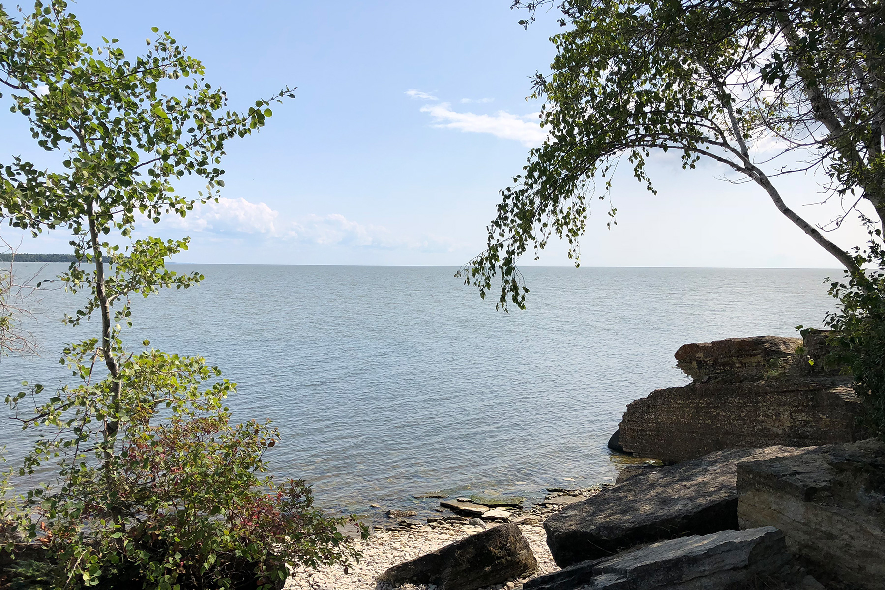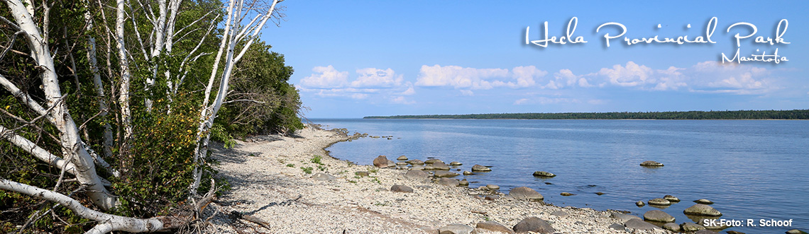 Für uns geht es dann noch etwa eine Stunde nach Norden. Ich möchte mir unbedingt den Hecla Provincial Park ansehen. Und natürlich das gleichnamige Resort-Hotel. Der Park liegt auf einer Insel, über die man auf einer Art Dammstraße durch die "Grassy Narrows" gelangt. Rechts und links sieht man immer wieder Pelikane, bevor es in den Inselwald geht. Großartig. Ein herrlicher Laubwald mit vielen Birken bzw. Pappeln – und plötzlich hat man das Gefühl, mitten in der Wildnis zu sein. Wunderschöne Uferstellen, tolle Sand- und Kies-Strände. Leicht zugänglich und teilweise sogar mit Picknicktischen und Feuerstellen. Und kein Mensch hier! Schon in Gimli war mir aufgefallen, wie leer es dort war für einen so attraktiven Ort. Gut, es ist Wochenanfang, aber schließlich mitten im August! Aber es scheint die Regel zu sein. Das Torhäuschen am Parkeingang zum Hecla Grindstone Provincial Park ist auch nicht besetzt. Na, das sollte man mal dem ein oder anderen flüstern, der sich über den stetig wachsenden Andrang in den Nationalparks der kanadischen Rockies ärgert!