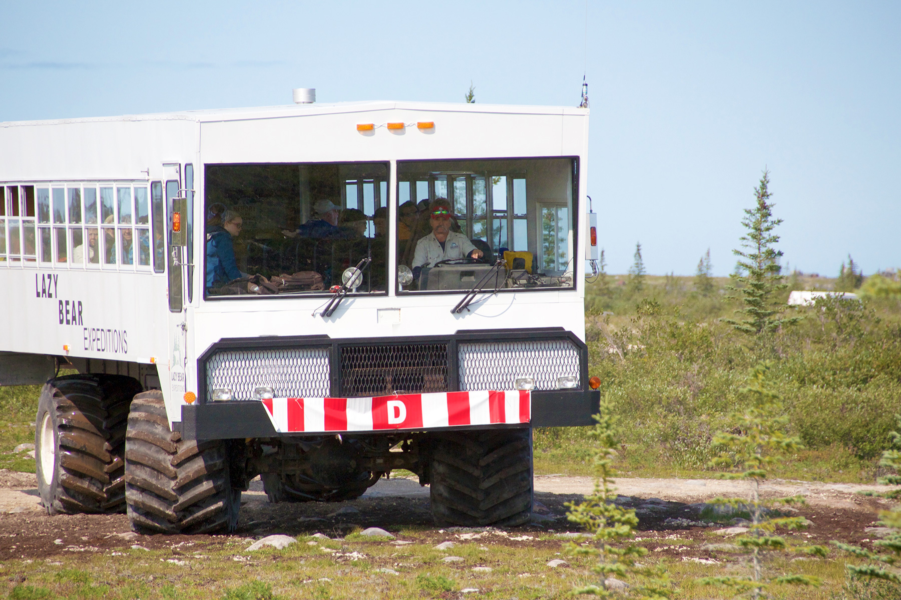 Dann aber auf zu den Polarbären. Auf zur Exkursion in die Küstentundra an Bord eines dieser mit Riesenreifen versehenen Spezialfahrzeuge. „Arctic Crawler“ nennt die Lazy Bear Lodge ihre eigenen Fahrzeuge dieser Art. Mit dem Bus geht es zunächst hinaus aus Churchill, zur sogenannten „Launch-Station“. Eine Art Rampe, an der die großen Fahrzeuge rückwärts andocken und über die man mittels Treppe und Steg einfach in die ja so dramatisch höhergelegten Fahrzeuge gelangt. Und dann geht's los, gefühlt tatsächlich im "Kriechtempo" – der Name "Crawler" passt also perfekt. Und jeder SUV-Fahrer mit echtem Geländemodus kennt dieses Fahren. Jede Unebenheit im Gelände wird von den stark profilierten und stoßgedämpften Reifen genommen, jeder Schlag geschluckt oder zumindest stark abgefedert. Und die langsame Fahrt durch die Tundra ist beeindruckend, die Küstenlinie einfach ein Traum. Guide Gerald sitzt auch beim Arctic Crawler hinter dem Steuer. Auf die Frage, ob er hierfür einen besonderen Führerschein machen musste, schmunzelt er: „Hmm, nein, ich hab’s halt einfach gelernt.“ Tja, so einfach ist hier im Norden! Und Gerald bringt uns mit seinem Crawler tief hinein in die Tundra, während Guide Deb uns mit allerhand biologischem und geographischem Wissen über das, was wir draußen sehen versorgt.