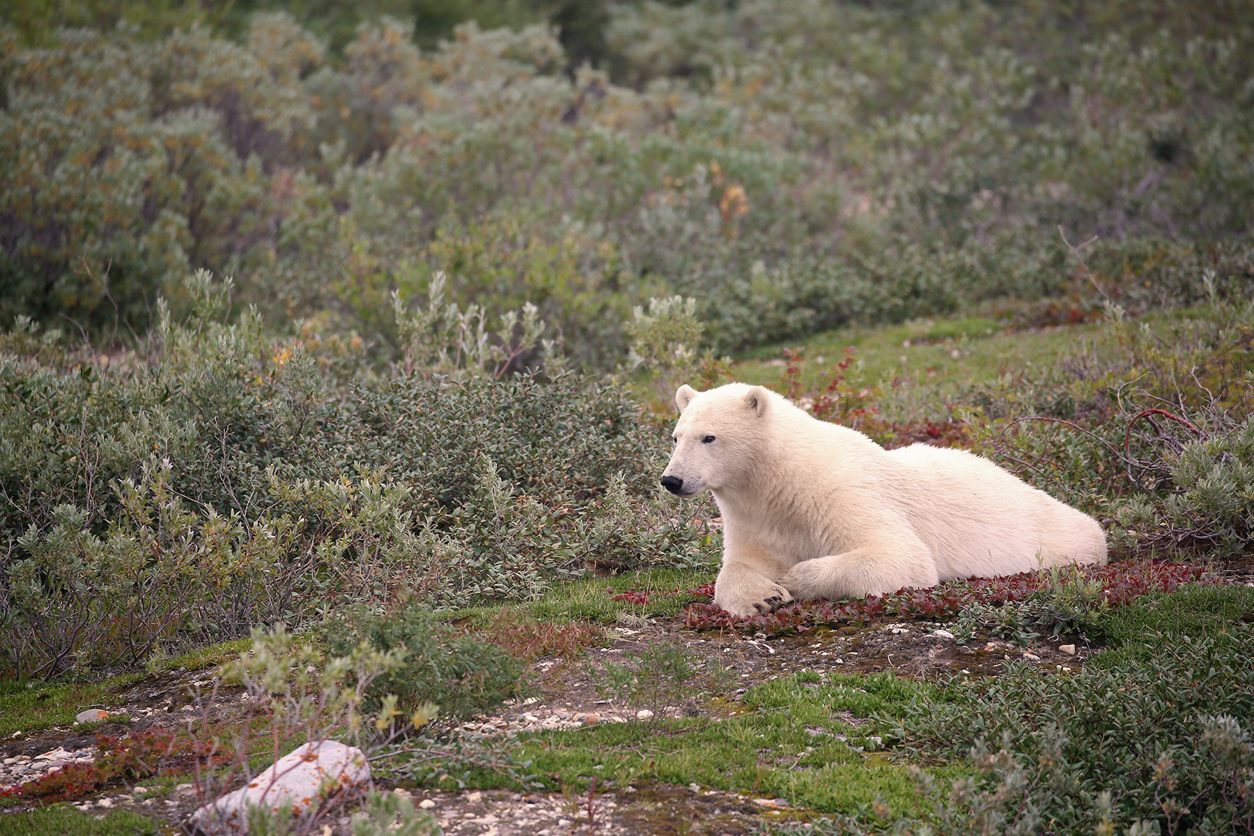 Der letzte Morgen in Churchill – nur noch wenige Stunden, bis unser Flug zurück nach Winnipeg abhebt. Der Bus bringt uns zurück zum Airport. Bye, bye, Churchill. Aber halt! Was ist das da Großes, Weißes am Wegesrand auf dem grünen Tundragrund? Natürlich, ein Polarbär! Und so nah! Mitten an der Schotterstraße – gerade außerhalb des Ortes! Was für eine Ironie, dass ich dem weißen Riesen der Arktis ausgerechnet auf dem Weg zurück zum Airport am allernächsten komme. Aber so ist er, der Norden. Er haut Dich um, wenn Du es am wenigsten erwartest! Und gut, dass hier im Norden alle so relaxed sind – auch unser Fahrer. Denn natürlich müssen wir einen langen, köstlichen Augenblick bei diesem majestätischen Tier verweilen und es auf alle erdenklichen Weisen fotografieren! Und zum Posieren legt der imposante Polarbär sich mächtig ins Zeug und macht – nichts! Oder fast nichts, bzw. er macht das, was fast alle Polarbären gemacht haben, die wir hier gesehen haben. Er ruht, liegt ausgestreckt da. Das Öffnen der Augen, das Heben des Kopfes – all das wird zum Highlight beim Foto-Shooting. Ein halbes Aufrichten – Hammer! –und dann der Wechsel der Liegeposition. Was für eine Action! Die Situation schreit nach Ironie, aber ich will sie nicht missverstanden wissen. Ich bin wirklich hellauf begeistert, so einen mächtigen Polarbären einmal so unglaublich nah vor mir zu sehen. Was für ein magischer Moment. Auge in Auge mit dem mächtigsten Raubtier des Nordens – also, wenn der Bär dann mal die Augen geöffnet hat. Aber es ist ein ganz besonderer Augenblick für mich. Ein Polarbär zum Abschied auf dem Weg zum Airport – wie zu meinem Geleit. Wie einzigartig!
