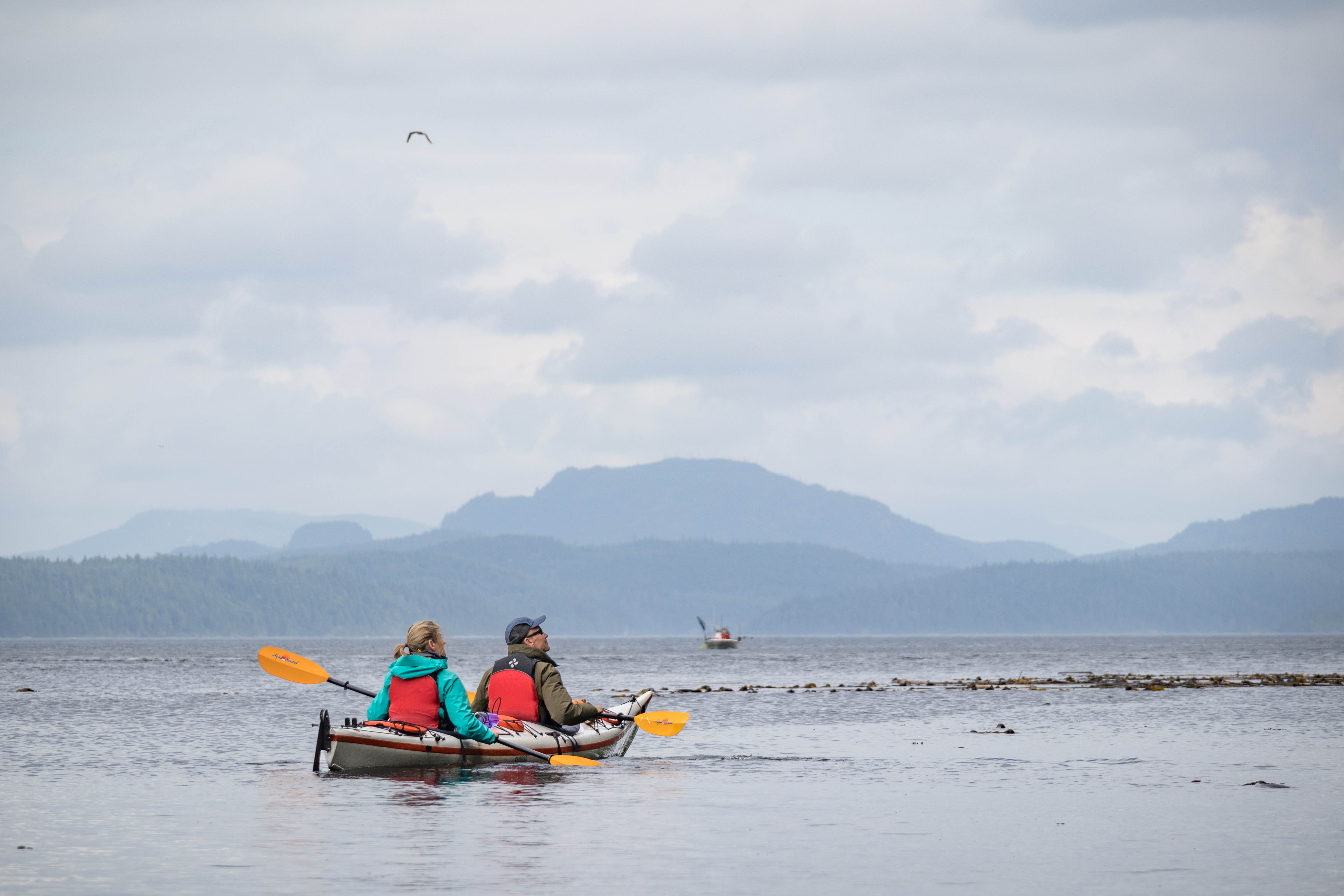 Per Zodiac-Boot geht es nach Telegraph Cove, von wo du im Kajak auf Erkundungstour entlang der Küste aufbrichst. In den Gewässern tummeln sich Buckelwale, Orcas und Seeadler. Mittagessen gibt es auf einer der Inseln oder an einem abgelegenen Strand. Danach geht es zurück nach Cormorant Island für die letzte Nacht in Alert Bay.
