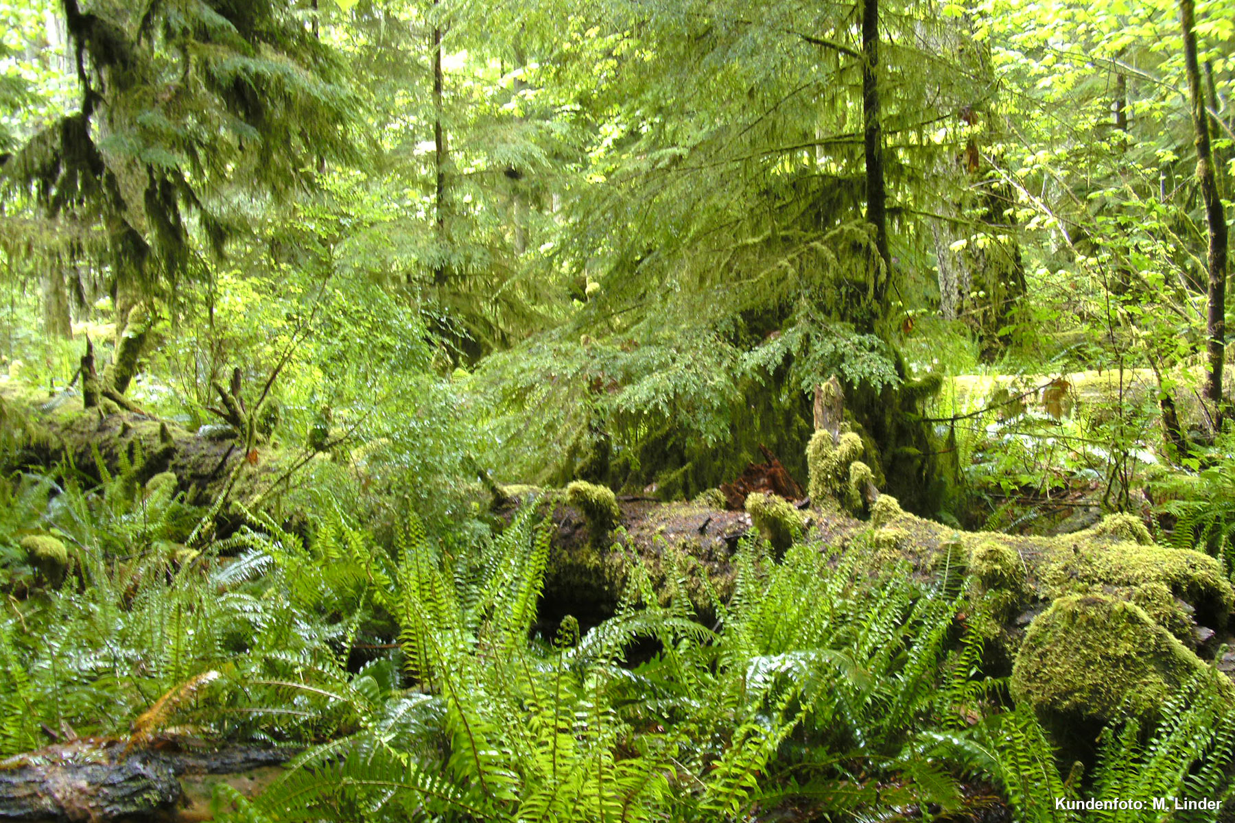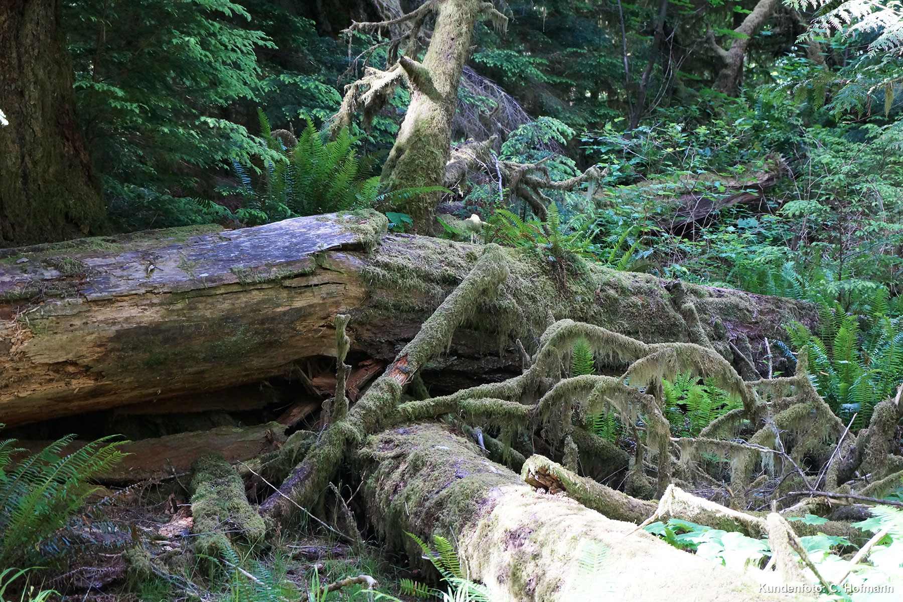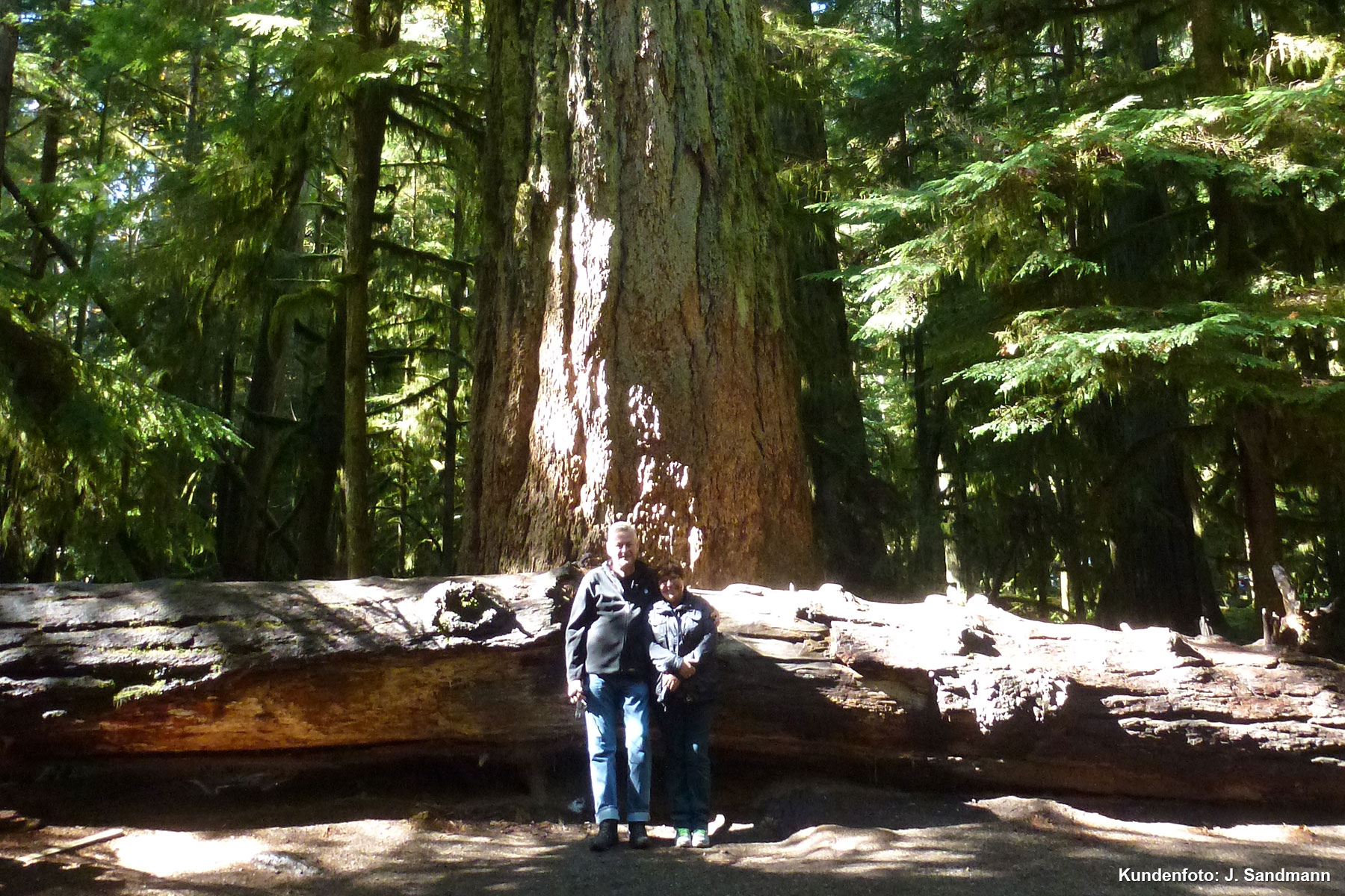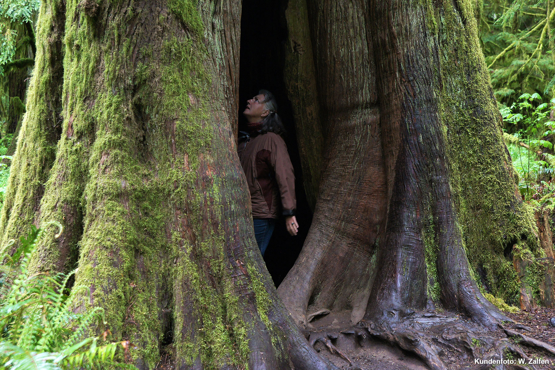 Cathedral Grove, als MacMillan Provincialpark geschützt, liegt 16 Kilomter östlich von Port Alberni (Vancouver Island) und wird vom Highway 4 in zwei Hälften geteilt. Der Park ist für seine nie geschlagenen Bestände 800 Jahre alter Douglasfichten berühmt. Die größten dieser Bäume messen über neun Meter im Umfang. Hübsche, zum Teil mit Planken ausgelegte Spazierwege führen von der Straße aus zu einigen dieser Baumriesen, von denen der höchste 90 Meter messen soll. Es ist verboten, die markierten Wege zu verlassen. Andere bemerkenswerte Bäume in diesem an einen Tolkien´schen Zauberwald erinnerenden Schutzgebiet sind Hemlocktannen und Riesen-Lebensbäume. Für kräftige Grüntöne sorgen auch Flechten, Moose und Farne, die umgestürzte Bäume in dicke, weiche Teppiche und Decken hüllen. Wer ein paar Minuten einhält und lauscht, wird es tropfen hören. Cathedral Grove liegt in der Zone des gemäßigten, bis nach Alaska reichenden Regenwalds. Während der Hochsaison wird der nur 300 Hektar große Park mitunter ein Opfer seiner Popularität: Weil die Parkplätze nicht reichen, werden die Autos links und rechts der Straße abgestellt, was den durchziehenden Verkehr erheblich behindern kann. Vorsicht also beim Ein- und Ausparken!
