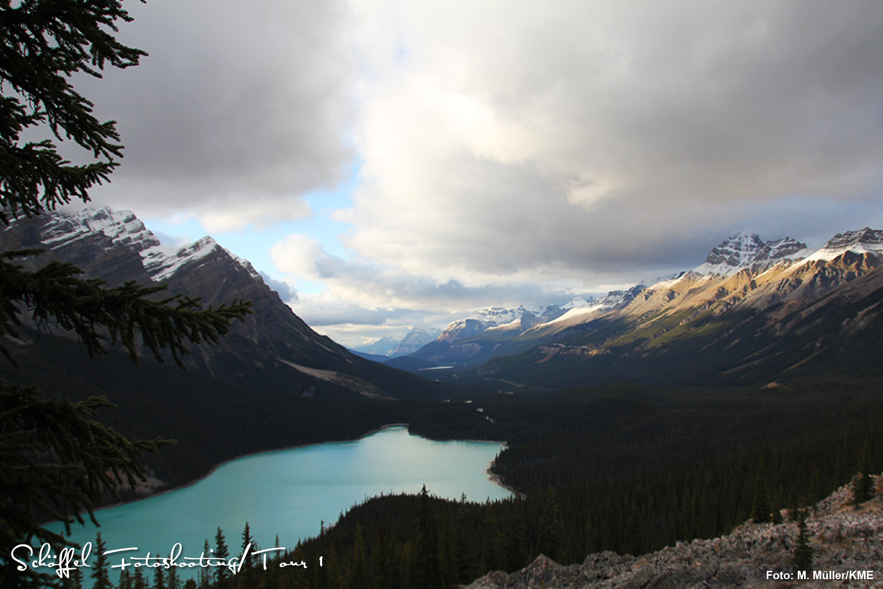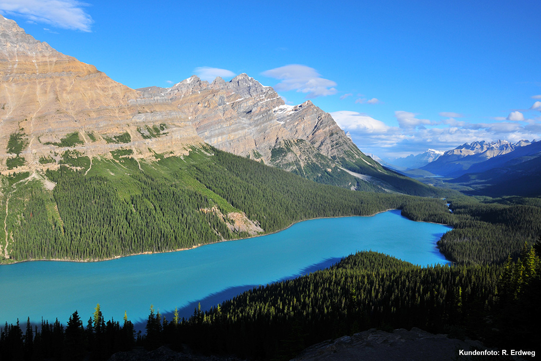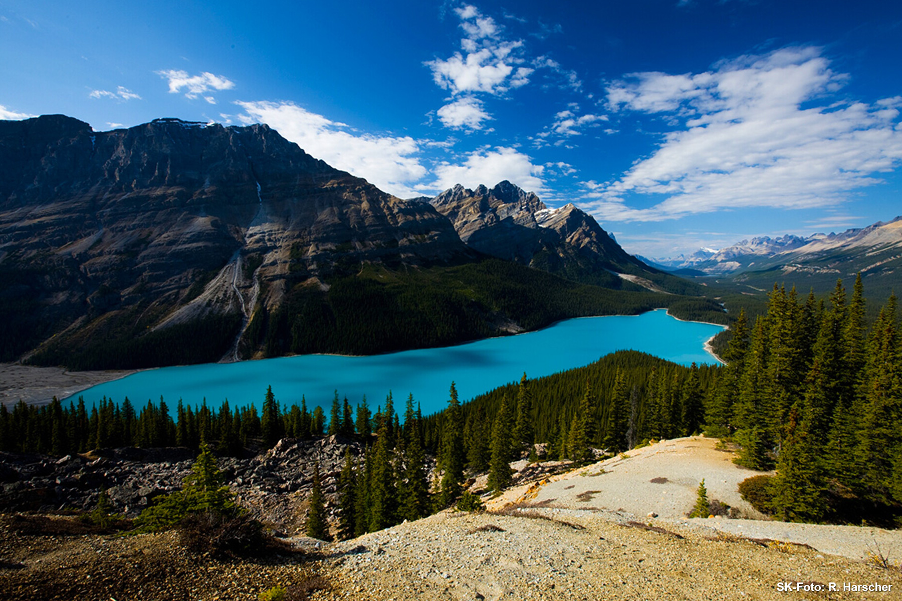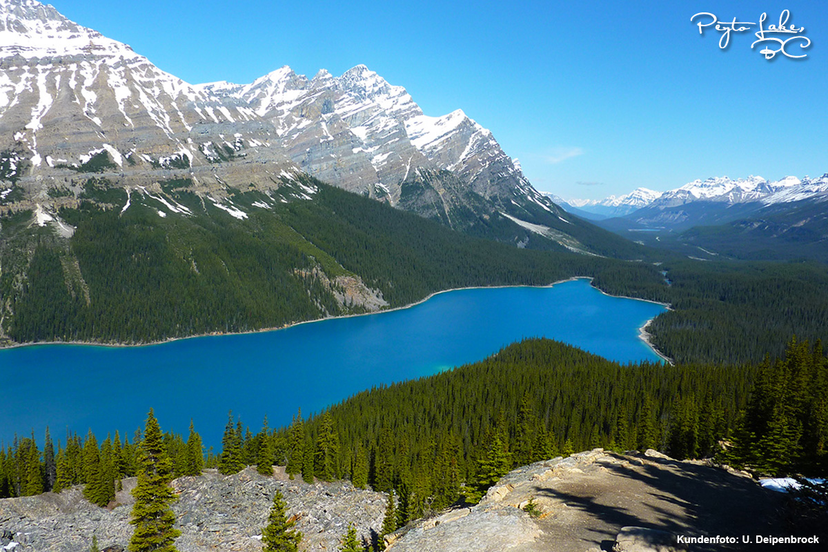 Ja, der Peyto Lake im Banff National Park ist wirklich so blau! Und er gehört natürlich zu den schönsten Fotomotiven in den kanadischen Rocky Mountains! Wir haben ihn zu jeder Tages- und Jahreszeit besucht und dürfen dafür getrost die Hand ins Feuer legen. Der nach dem frühen Trapper und Wildnisführer-Pionier Bill Peyto benannte See liegt 40 Kilometer nördlich von Lake Louise am berühmten Icefields Parkway. Er ist 2,8 Kilometer lang, bis zu 800 Meter breit und ist umgeben von majestätischen Gipfeln mit dunkelgrünen Waldhängen. Aufgrund der Lage auf 1880 Metern Höhe, ist auch im Frühsommer noch mit Eis auf dem Wasser zu rechnen. Das herrliche Blau stammt vom glazialen Gesteinsmehl, das vom Peyto-Gletscher in den See fließt. Den besten Blick hat man vom Bow Summit, den man vom Parkplatz aus in wenigen Gehminuten erreicht. Unser Tipp: Wer mit dem Hammer-Panorama allein sein möchte, sollte so früh wie möglich vor Ort sein!