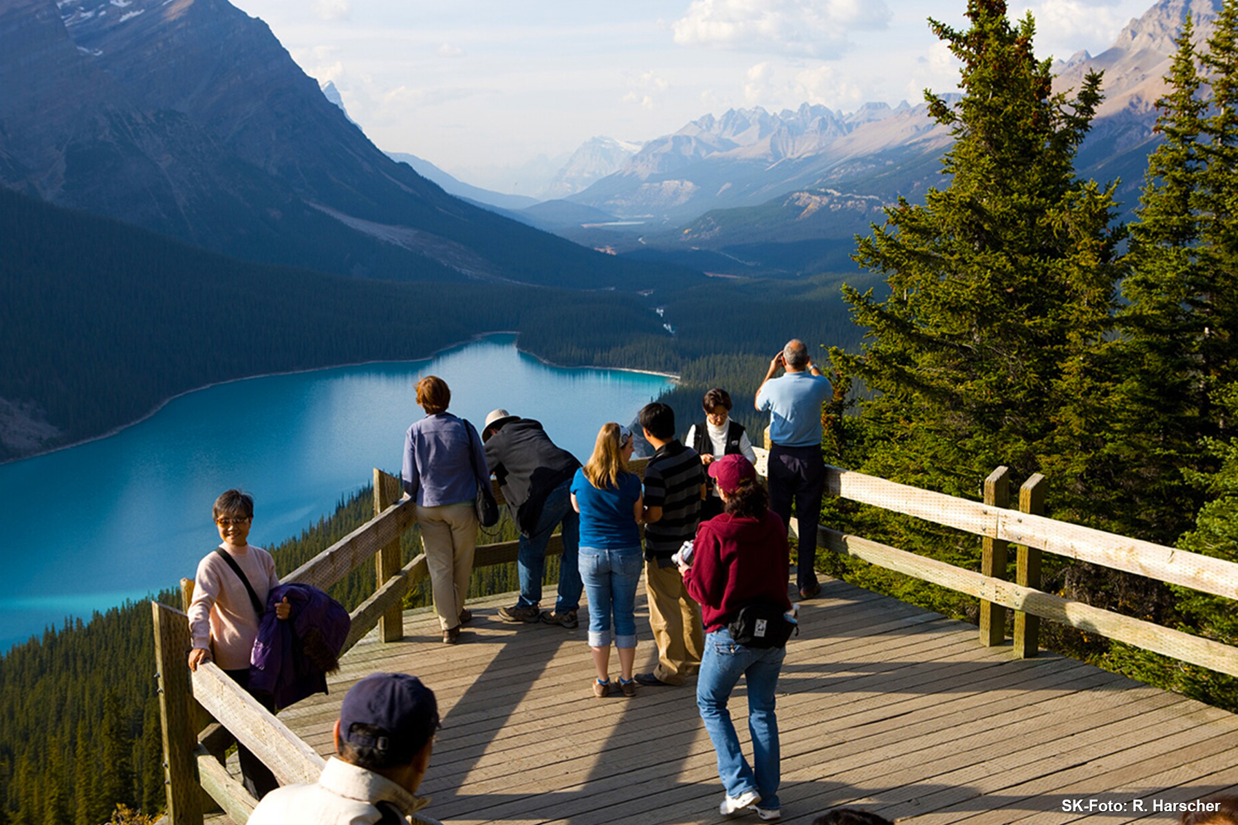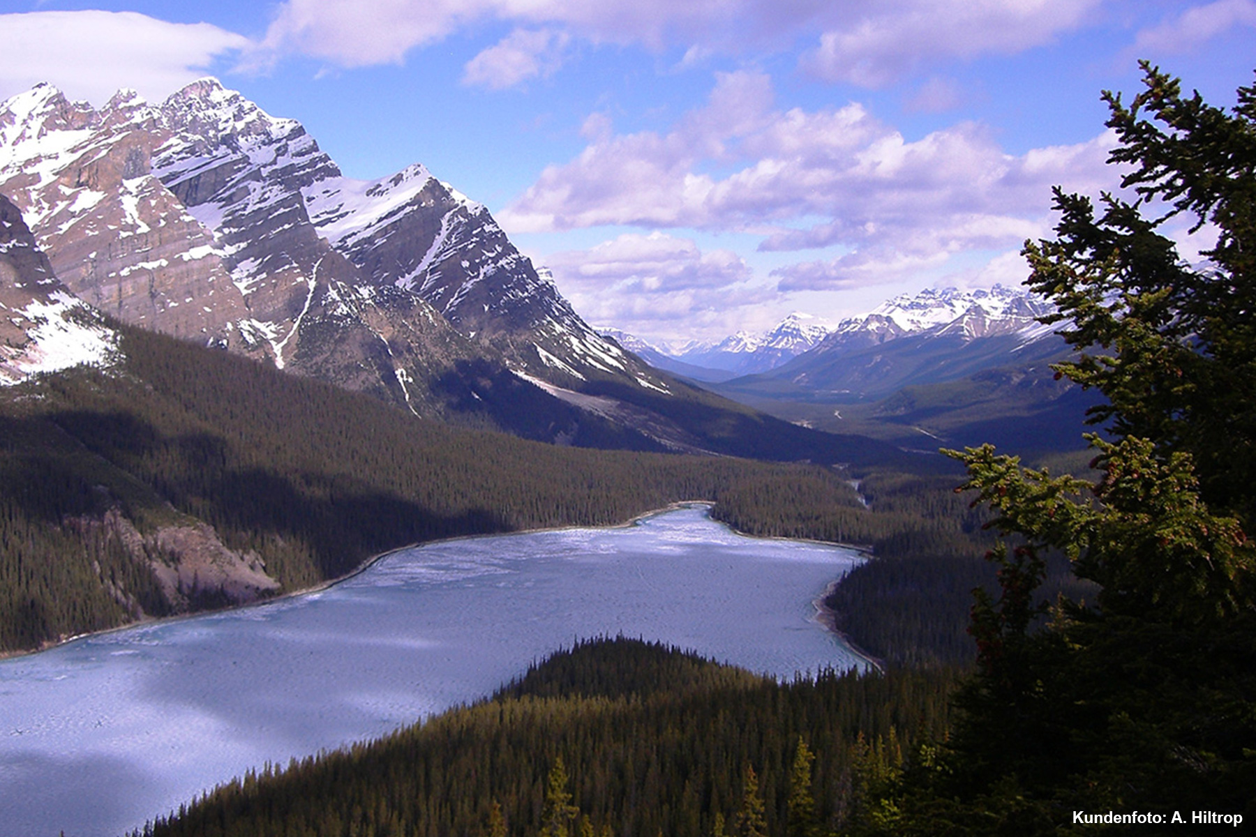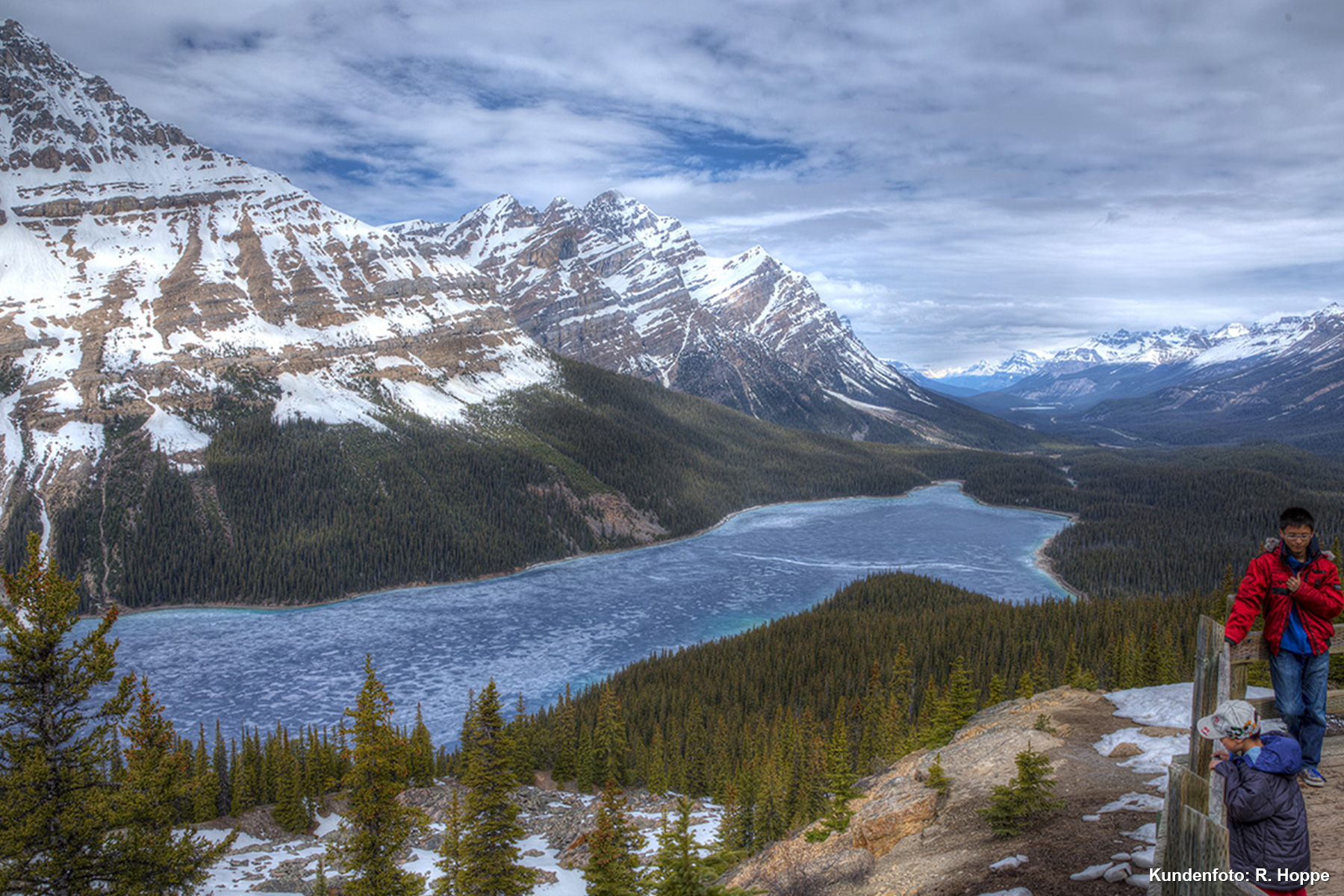 Ja, der Peyto Lake im Banff National Park ist wirklich so blau! Und er gehört natürlich zu den schönsten Fotomotiven in den kanadischen Rocky Mountains! Wir haben ihn zu jeder Tages- und Jahreszeit besucht und dürfen dafür getrost die Hand ins Feuer legen. Der nach dem frühen Trapper und Wildnisführer-Pionier Bill Peyto benannte See liegt 40 Kilometer nördlich von Lake Louise am berühmten Icefields Parkway. Er ist 2,8 Kilometer lang, bis zu 800 Meter breit und ist umgeben von majestätischen Gipfeln mit dunkelgrünen Waldhängen. Aufgrund der Lage auf 1880 Metern Höhe, ist auch im Frühsommer noch mit Eis auf dem Wasser zu rechnen. Das herrliche Blau stammt vom glazialen Gesteinsmehl, das vom Peyto-Gletscher in den See fließt. Den besten Blick hat man vom Bow Summit, den man vom Parkplatz aus in wenigen Gehminuten erreicht. Unser Tipp: Wer mit dem Hammer-Panorama allein sein möchte, sollte so früh wie möglich vor Ort sein!