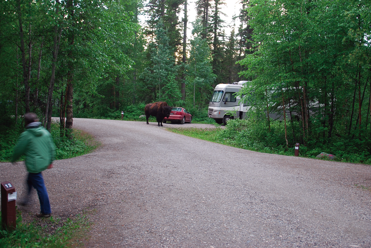Nach insgesamt zehn Tagen biege ich bei Fort Nelson auf den Alaska-Highway ab. Der tadellose Asphalt ist eine Erholung, doch an den Gegenverkehr muss ich mich erst wieder gewöhnen. Dazu spult die legendäre Fernstraße ihre Highlights so routiniert ab, dass ich mich schon bald wieder nach etwas Unvorhergesehenem sehne. Dass ich noch immer in der Wildnis bin, daran werde ich abends im Restaurant gegenüber der Liard Hot Springs erinnert. Schon wieder Büffel. Dieses Mal wandert eine ganze Herde über den Alaska-Highway. Erst nach Einbruch der Dunkelheit ist die Straße frei, und ich kann zurück zu meinem Camper gelangen. Bis Whitehorse ist es nun nicht mehr weit. Das schaffe ich morgen. Schade.
