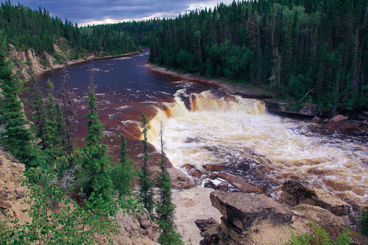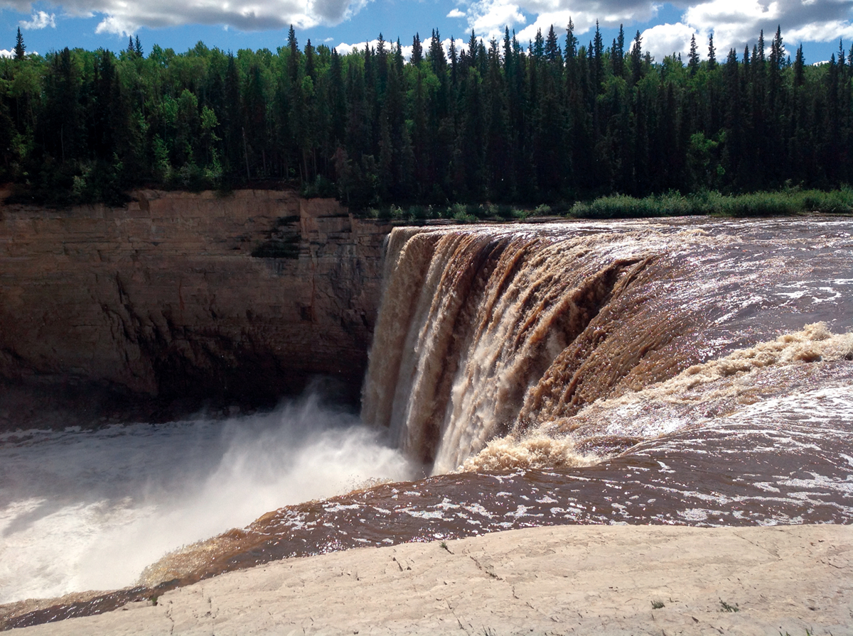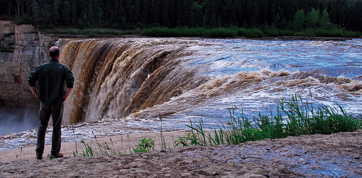 "Such dir den besten Platz aus", ruft er durchs Autofenster, "und schieb das Geld morgen unter der Bürotür durch!" Am Ende sehe ich auf dem Weg zum Büffel-Nationalpark mehr dieser Fleischberge als im Park selbst. Bullen, Kühe, Junge. Safari-Momente wie in Afrika. Auch auf dem Weg zurück nach Westen bin ich mutterseelenallein. Manchmal halte ich an, falte meinen Klappstuhl auseinander und nehme eine Weile mitten auf der Piste Platz, um in die Stille zu lauschen. In Deutschland undenkbar. Nicht die schlechteste Art, ein Gefühl für das Land zu bekommen. Genau das bezweckt auch Doug Lamalice mit seiner Tour "Walk a mile in my Mocassins". Der massige Dene First Nations lebt südlich von Hay River und nimmt seine Gäste mit auf eine zweieinhalb Kilometer lange Reise durch seine Kultur. Dabei dienen die spektakulären Alexandra-und-Louise-Wasserfälle im Twin Falls Gorge Territorial Park als Kulisse. "Meine Gäste sollen Mutter Natur spüren und lernen, mit ihr anstatt gegen sie zu arbeiten." Nach einem Gebet marschieren wir los. Doug erzählt von Traditionen und Zeremonien, wie seine Vorfahren die Kanus um die unfahrbaren Wasserfälle zogen und die Jungen in feierlichen Zeremonien zu Männern wurden. Das ist zwar lange her, doch das Land ist dasselbe. Es macht die Menschen, wie man hier sagt. Auch an mir arbeitet es. Jeden Tag fällt ein wenig mehr Stress von mir ab. Der Spagat zwischen Vergangenheit und Gegenwart sei nicht einfach, sagt Doug, es gebe aber auch eindeutige Vorteile. "Früher brauchten wir 14 Tage, um den Great Slave Lake zu erreichen. Heute sind wir in 45 Minuten da. Wenn die Straße okay ist!