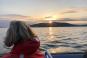 Vorbei geht es an der Landspitze mit dem Leuchtturm. Und eigentlich, auch wenn es sich für alle, die so etwas schon einmal gemacht haben, ein bisschen so anfühlt, als würde man mit dem Zodiac zur Tierbeobachtung rausfahren, hatten wir ja gar keine Tiere erwartet. Da sind die Robbenfelsen auf unserem Weg natürlich ein regelrechter Bonus. Einige Seehunde räkeln sich in der Abendsonne, andere schwimmen um die kleinen Felseninseln herum und tauchen immer wieder vor uns auf, um uns neugierig anzugucken. Nicht schlecht für so eine Fahrt zum Abendessen!