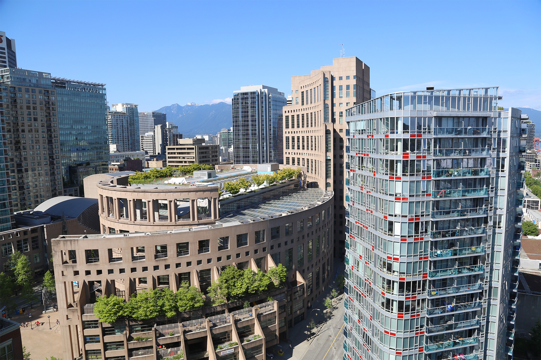 Auf geht’s! Wir wollen den ersten vollen Tag in Vancouver so beginnen, wie ich ihn als Tour-Guide Anfang der Neunziger immer mit meinen Gruppen begonnen habe: Frühmorgens auf dem Vancouver Lookout im Harbour Center. Entsprechend früh stiefeln wir vom Rosedale los. Nein, ein Taxi braucht man für die paar Blocks nicht. Außerdem finde ich die ersten Schritte am Morgen in der Pazifikmetropole immer besonders stimmungsvoll – wenn alles um einen herum erwacht und in Bewegung kommt, wenn die ersten Herren in grauen Anzügen auf die verspiegelten Wolkenkratzer zuströmen, wenn es an der Fußgängerampel rechts und links aus den Pappbechern nach Kaffee riecht und sämtliche Starbucks-Filialen auf dem Weg schon Hochkonjunktur haben.