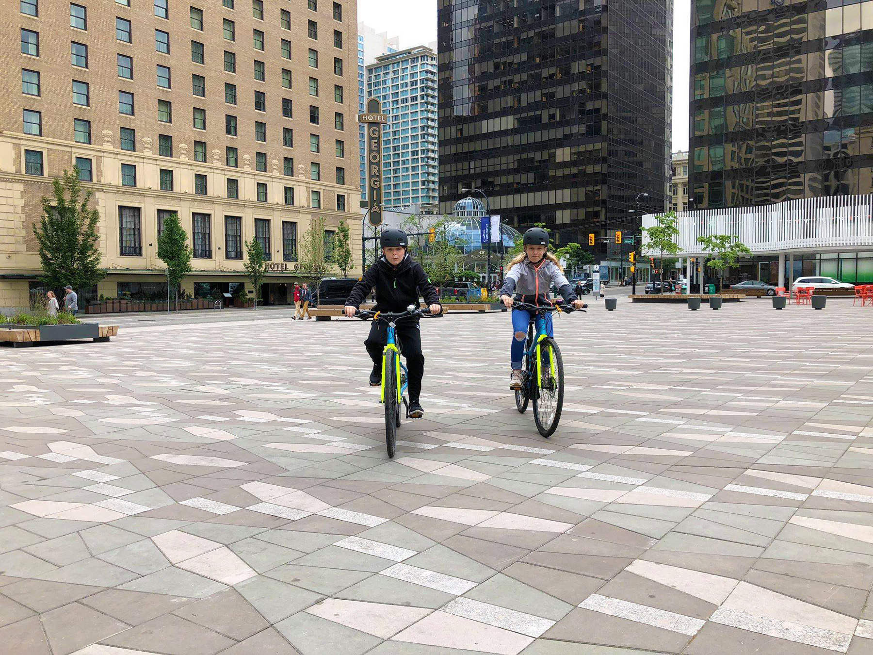 Adam berät uns bei den Leihrädern, die wir letztlich dann aber selbst auswählen dürfen. Alles wird eingestellt, vor allem die Sitzhöhe. Und Helme gibt’s auch. Wer möchte, kann auch einen Fahrradkorb dazubekommen. Ich bin beeindruckt von der Materialqualität. Die Räder sehen aus wie geleckt – und es sind sicher nicht die günstigsten. Ich steige auf und fahre ein paar Testmeter – vor dem Laden geht direkt einer der neuen Radwege her – und bin begeistert. Sehr leichtläufig, die Schaltung wie bei meinem Rad zuhause. Also wegen mir kann’s losgehen. Noch nicht ganz, lässt mich Adam geduldig lächelnd wissen. Nein, zunächst schieben wir alle die Räder zum wenige Meter entfernten Robson Square und jeder kann erst einmal ein paar Testrunden drehen, um sich mit dem Rad vertraut zu machen. Wie leichtläufig ist es, wie stark greifen die Bremsen? Macht schon Sinn so. Dauert ja auch nur ein paar wenige Minuten. Und dann geht’s los.