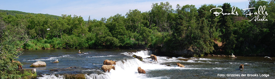 Zur Zeit der Lachswanderung können teilweise regelrechte Bärenansammlungen am Fluss beobachtet werden. Denn nun haben sie leichtes Spiel. Die stromaufwärts schwimmenden Lachse springen an den Stromschnellen aus dem Wasser - und den wartenden Bären direkt ins offene Maul. Ein wahres Festmahl!