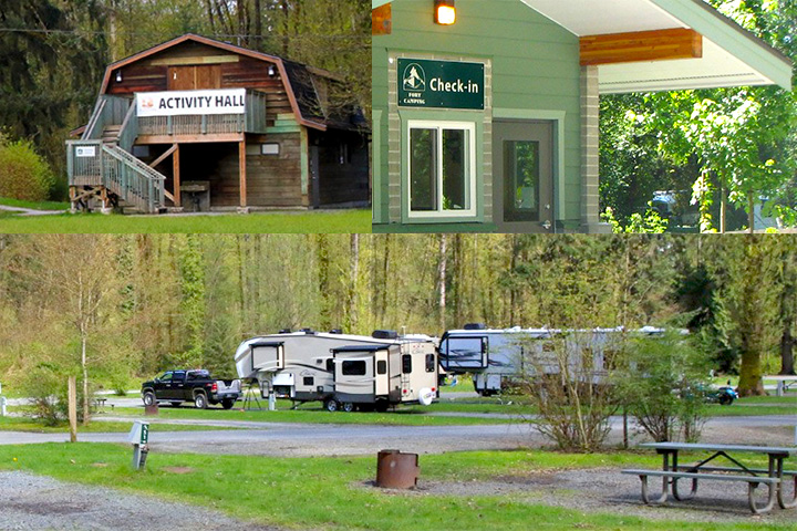 Dieser Campground in Fort Langley befindet sich gut 50 Kilometer von Vancouver Downtown entfernt auf McMillan Island am Fraser River. Vom Highway 1 nimmst du die Abfahrt nach Fort Langley (von der 1 die 2. Ausfahrtspur und nach rechts auf die 232. Street (Livingstone Road), die in den Rawlison Crescent übergeht. Diese Straße führt dich auf die Glover Road, auf die du nach rechts abbiegst (alternativ: 1. Ausfahrtspur und nach links auf die 232. Straße bzw. den Highway 10, der dich auf die Glover Road bringt, nur südlich des Freeways - hier dann auch rechts abbiegen). Dann durch Fort Langley bis du den Campground (zu deiner Linken) erreichst – am Nordende der Brücke über einen Seitenarm des Fraser River.