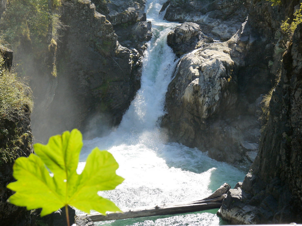 Start um 9:50 Uhr . Heute geschlafen bis 7:50. Auf dem Tisch sortiert gerade ein Eichhörnchen die Erdbeerreste. Zum Frühstück gibt's Waffeln und Erdbeeren. Aufgrund der Tipps von 2 netten einheimischen Hundebesitzerinnen fahren wir in Richtung Nakusp #23 bis Blanket Creek. Dort gibt es den spektakulären Wasserfall Sutherland Falls. Der Columbia River fließt entlang unserer Fahrstrecke. Auf der Campingwiese tummeln sich Murmeltiere. Am Straßenrand stehen immer wieder Hirsche. Weiter geht es zur Fähre an der Shelter Bay. Wir setzen über den Upper Arrow Lake. Überfahrt ist kostenlos; auf der Fähre sind Holztransporter, ebenso RVs und PKWs. Über einen freundlichen Hund auf einem Pick-up kommen wir mit dessen Herrchen ins Gespräch. Er baut Motorräder und fährt mit Kumpels in 22 Std. von Toronto nach Daytona Beach. Auf der anderen Seite fahren wir noch bis zu den Halycon Hot Springs. Anschauen und Umkehren. Zu viel Trubel und nicht so ungemein interessant. Wir machen Rast am Straßenrand und braten Bacon, Spiegelei und Bratkartoffeln. Wieder auf der Fähre bei Galena Bay, raues Wetter. Bis Ravelstoke folgen wir einem Langholz Transporter, der mit Tempo 110km über den gesamten Weg die Fahrzeuge der Fähre anführt. Ein Abstecher führt uns noch zum Ravelstoke Damm. Dort ist aber noch alles geschlossen. Trotzdem: der Damm ist gewaltig und sehenswert. Zurück ins Städtchen, kleiner Bummel, Supermarkt und schließlich Essen in einem indisch-deutschen Restaurant. Die Küchenchefin hat in Österreich gelernt. Wieder auf dem CG hilft uns ein Ire beim Abwasser und wieder gibt es ein nettes Gespräch bei Bier und Lagerfeuer.