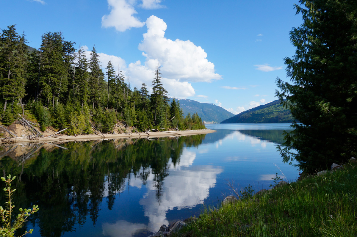 Start 09:05, Tankstopp in West Kelowna (70l) und Lebensmittel aufgefüllt, Kassiererin gewährt uns Kunden-Rabatt, weil wir aus Germany kommen. Sie fragt extra den Marktleiter. Das ist nett! In Kelowna City Center kleiner Snack in Dutch Bakery (Zimtbrezel!, Bernard Av.) und in City Mall ausgefallene Kleidung entdeckt. Nächster Zwischenstopp in Enderby (früher berühmt für Sägemühle und Holzflößen). Ab Sicamous auf TCH bis Revelstoke, Williams Lake CG. Revelstoke ist ein zauberhafter kleiner Ort, der wohl eine starke Skisaison hat. Unser CG ist fully serviced, d.h.wir haben Elektroanschluss, heißes Wasser zum Duschen und Geschirrspülen, der Verwalter ist aus Schwäbisch Hall. Feuerholz gibt es für 4$. Im Williamson Lake kann man schwimmen und es gibt einen Mini-Strand. Ein uriger Trail führt um den See, wie ein echter Urwald mit Baumstümpfen von riesigen Rotzedern.