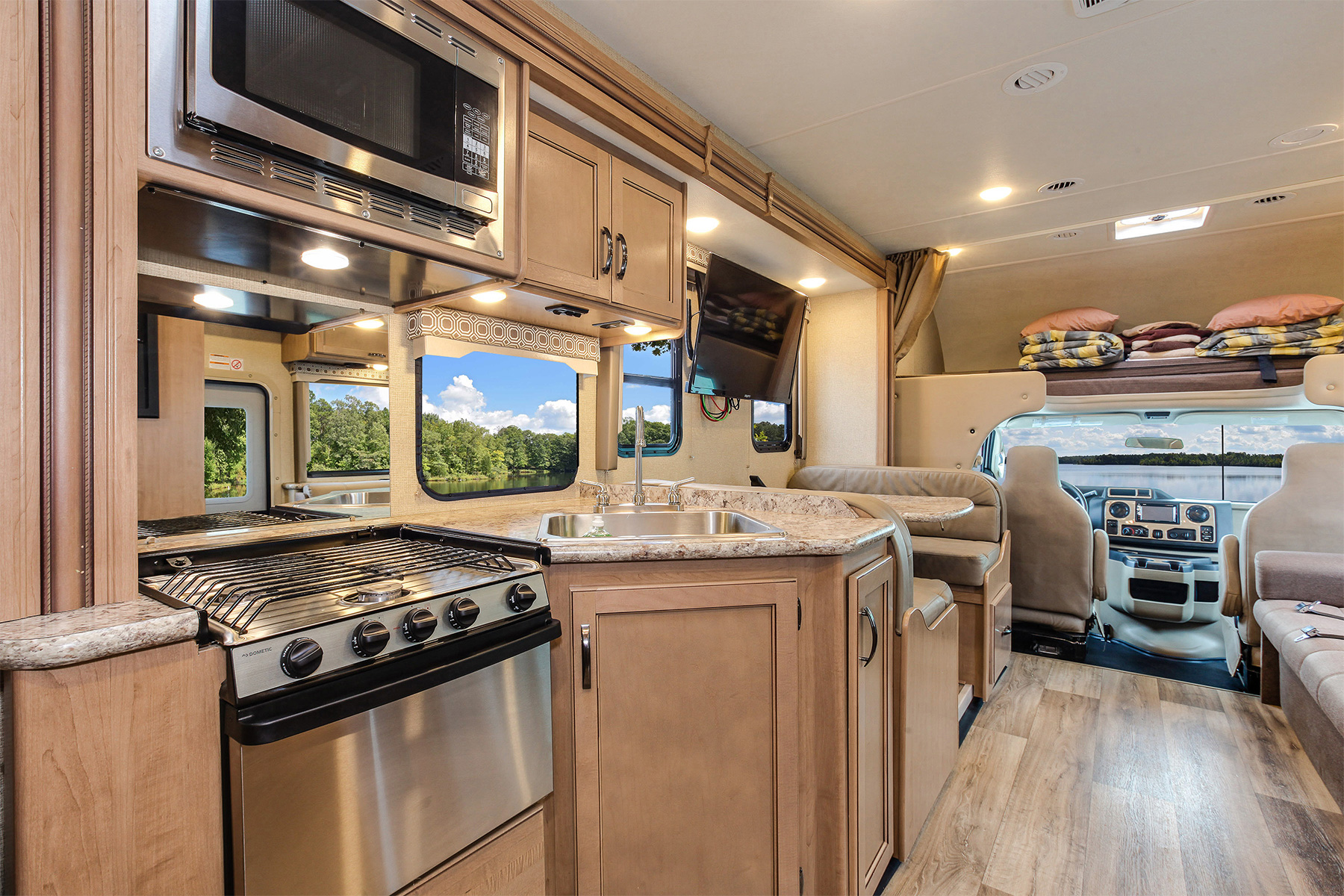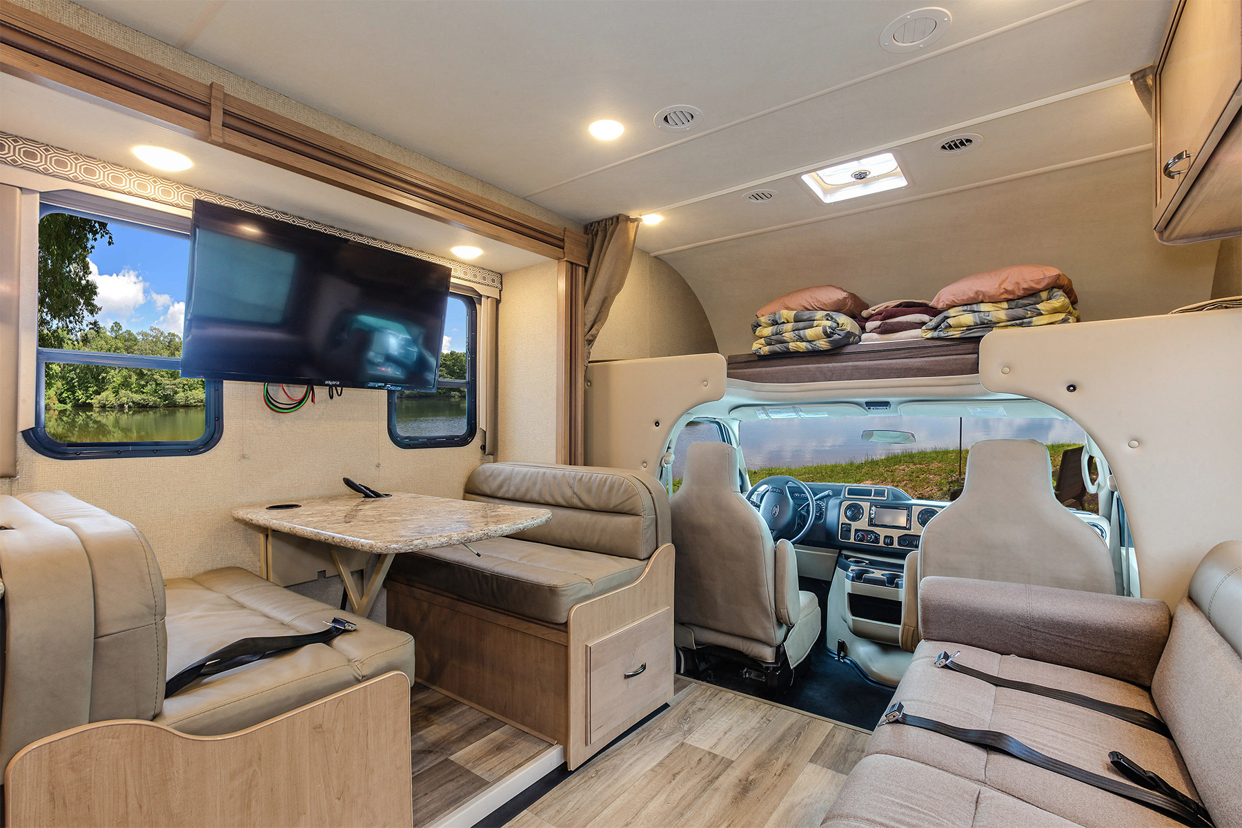 Technische Daten:Benzin (Tank: 205 l), V10-Motor, Automatik-Getriebe, Tempomat, Servolenkung, ABS, separate Batterien für Fahrzeug und Wohnteil, Propantank (69 l), Frischwassertank (150 l), Abwassertanks (grau: 142 l / schwarz: 101 l)