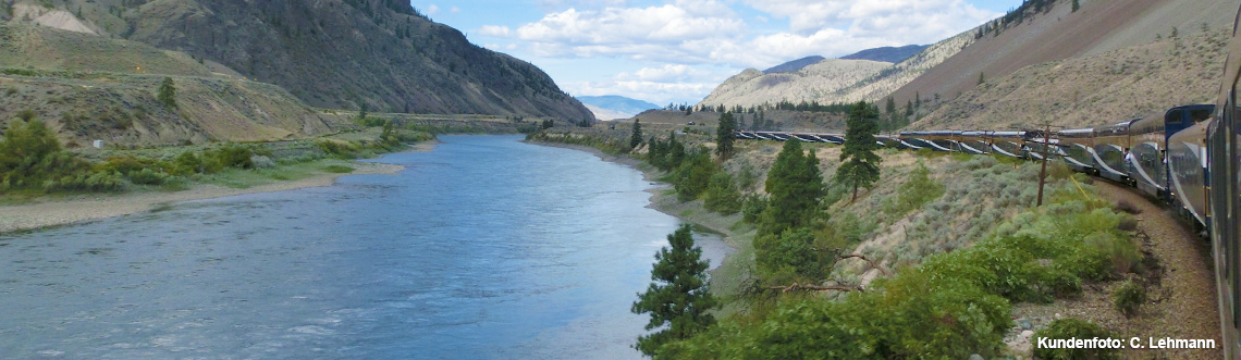 Von Vancouver geht die Fahrt durch die Flussebene des Fraser Valley, bevor der Zug in den Fraser Canyon einfährt. Am frühen Nachmittag führen die Gleise entlang des Thompson River nach Kamloops in der Thompson-Okanagan-Region. Hotelübernachtung.